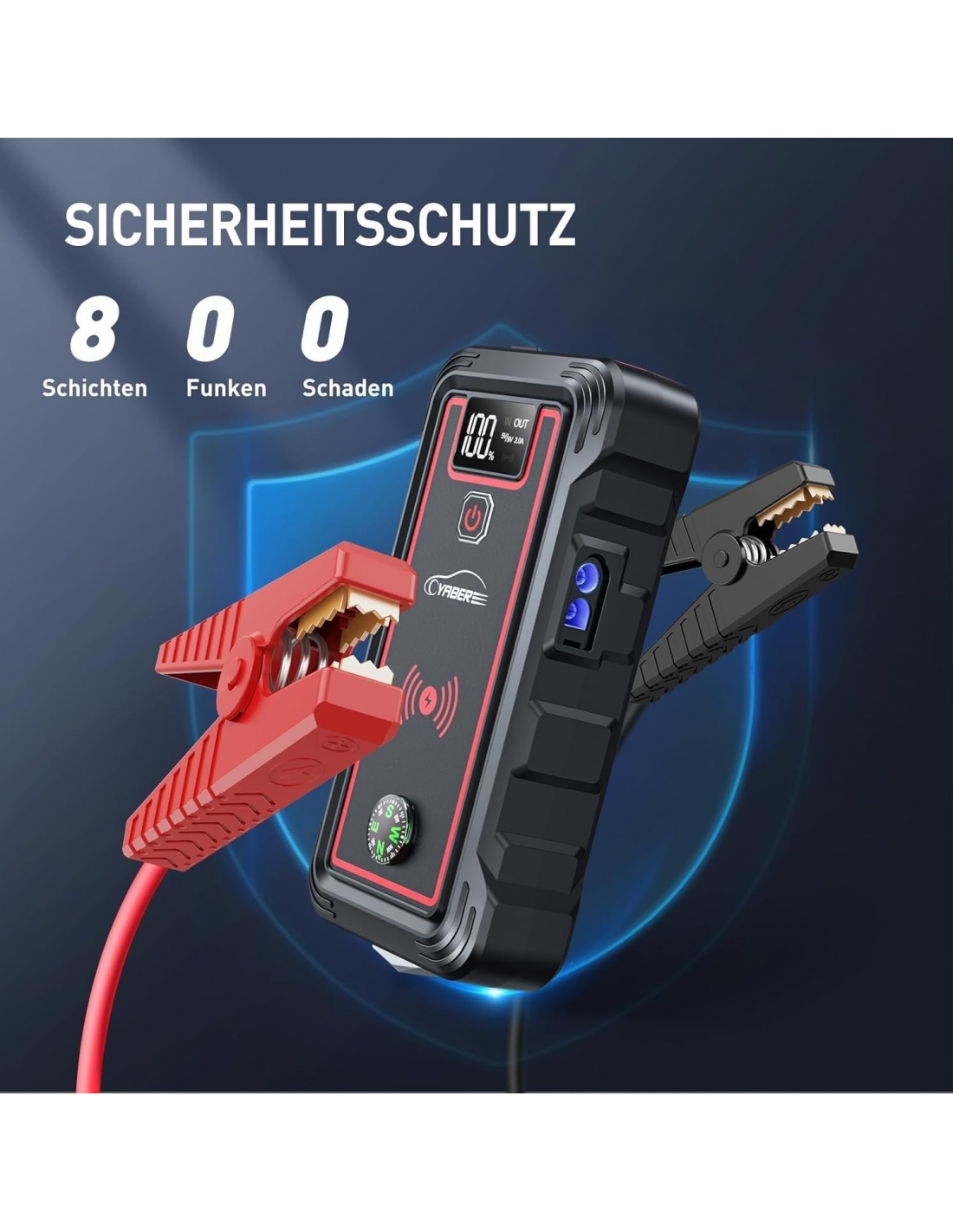 YABER YR800 Avviatore Batteria Auto, 5000A 10W Caricatore Wireless 23800mAh Avviatore Emergenza per Auto (Tutti Gas/8.0L Diesel) con Torcia,Ricarica Rapida USB 18W,Uscita DC,Bussola,Martello di Sicurezza