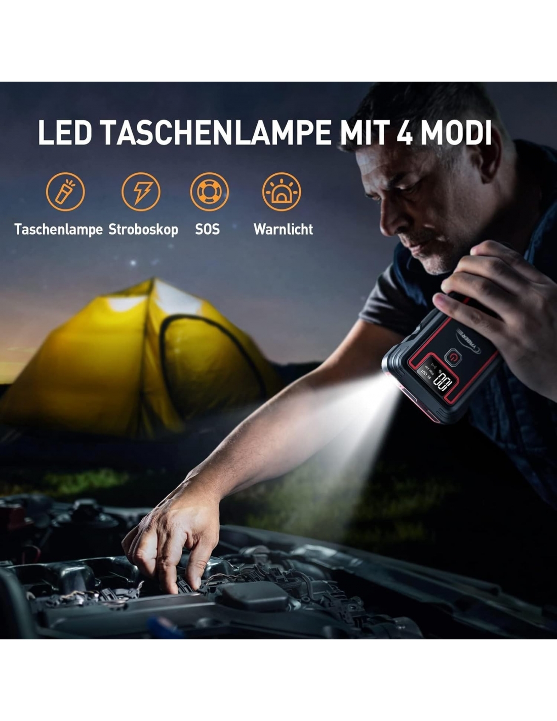 - 【FUNZIONI DI EMERGENZA】Questo booster avviamento auto può, inoltre, funzionare come torcia e spia luminosa. Ha una bussola d'emergenza e lo schermo LCD mostra la potenza rimanente e lo stato operativo dell'avviatore di avviamento. Le punte affilate in acciaio inossidabile possono rompere i finestrini del veicolo in caso di emergenza.