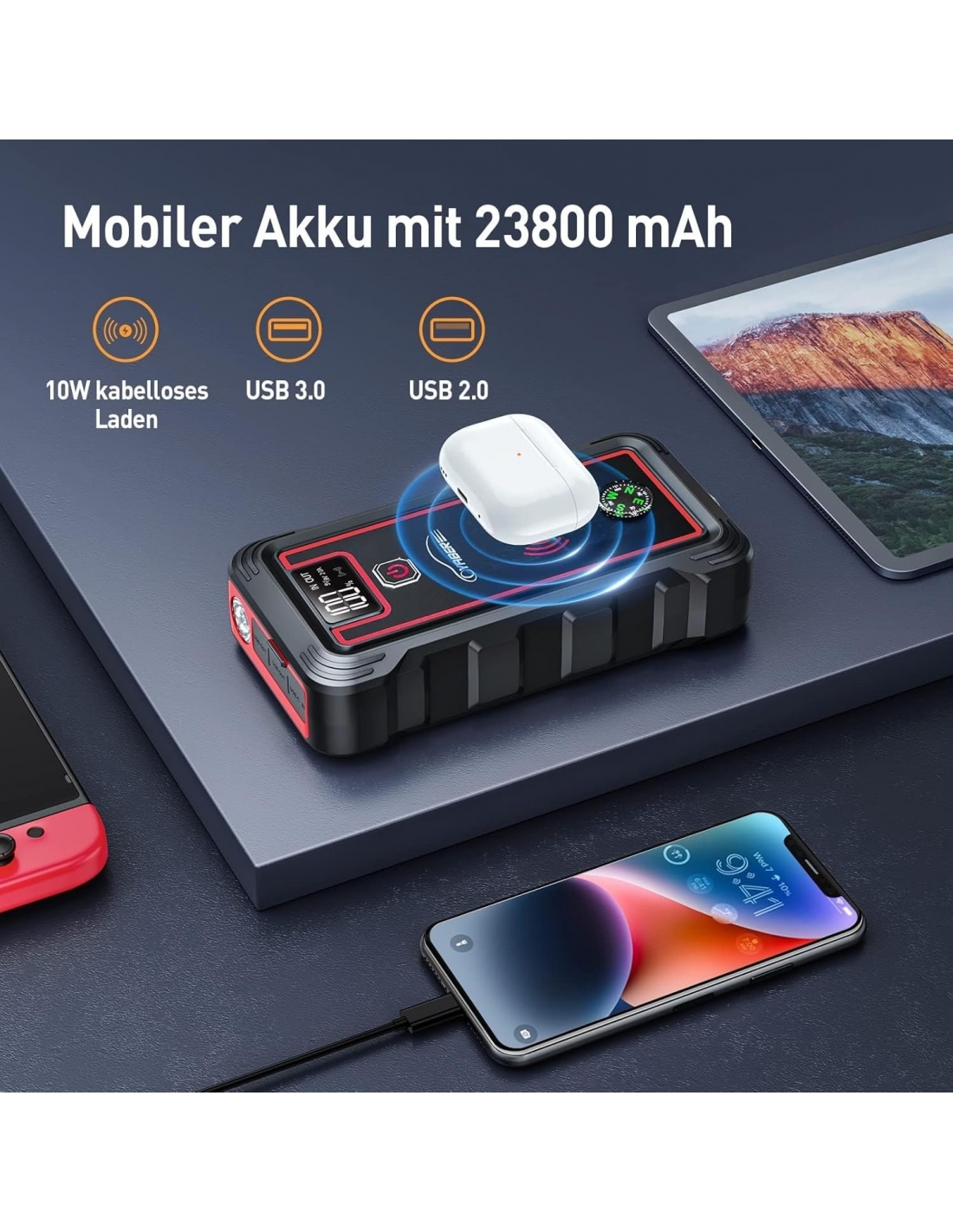 - 【CARICABATTERIE WIRELESS 10W】YR800 avviatore batteria auto con caricabatterie wireless da 10W ti consente di utilizzare il modo più veloce di ricarica, posizionando semplicemente il tuo smartphone sullo starter e il gioco è fatto.