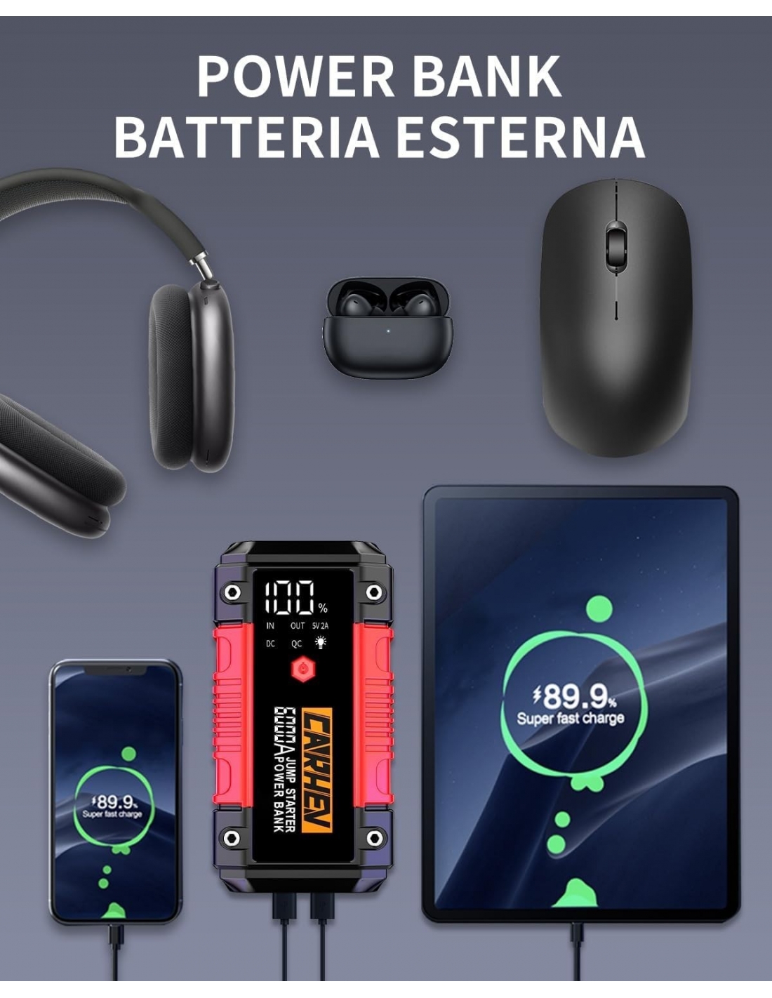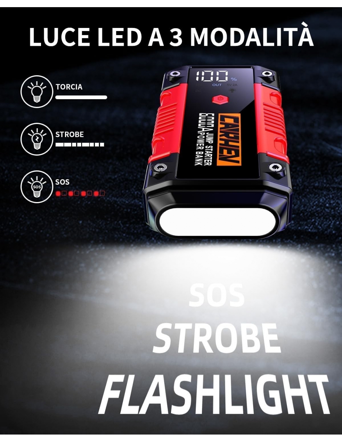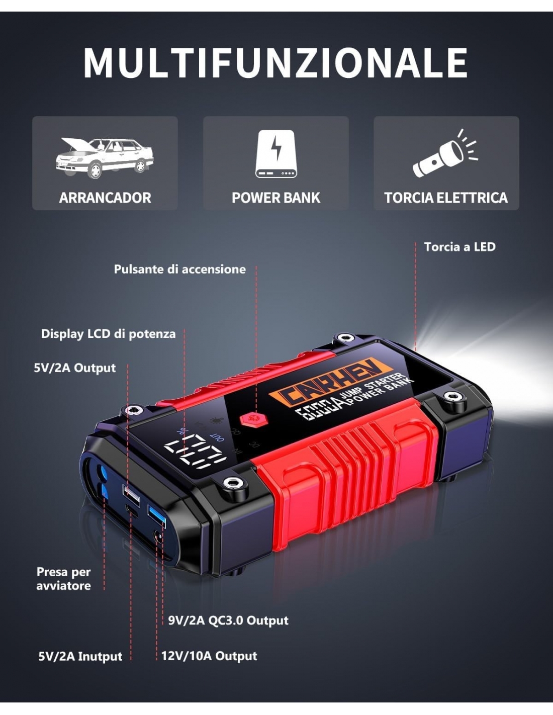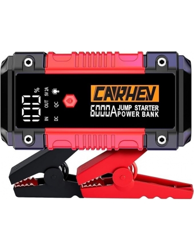 - 【6-IN-1 AVVIATORE DI EMERGENZA 】Il CARHEV Avviatore Batteria Auto al salto di maggiore capacità è dotato di 2 uscite USB (9V/2A e 5V/2A), Può caricare rapidamente il telefono cellulare e altri dispositivi, torce LED integrate con 3 modalità Flash/Strobe/SOS, offrendo la massima comodità e flessibilità. Inoltre, grazie a una porta da 12V/10A, la jump starter può alimentare anche apparecchiature a 12V DC come gonfiatori di pneumatici e aspirapolvere per auto.