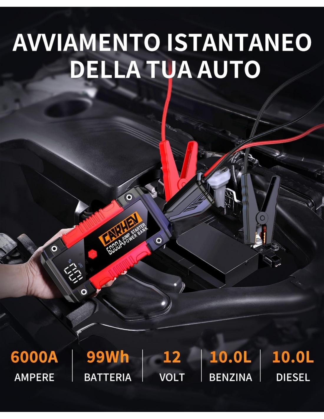 - 【PERFOMANCE SENZA PARI】CARHEV raggiunge una corrente di picco di 6000 Ampere e può avviare qualsiasi veicolo a 12V in pochi secondi [fino a motori a nzina e diesel da 10,0 L], fino a 50 volte con una sola carica. adatto a tutte le auto da 12 V, SUV, camion, motociclette, barche, motoslitte, motoslitte, pickup, ecc.