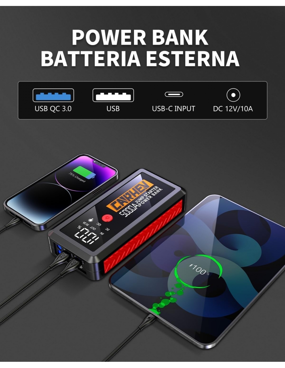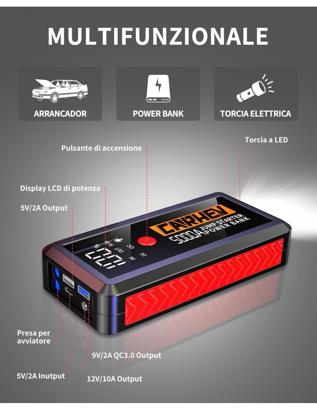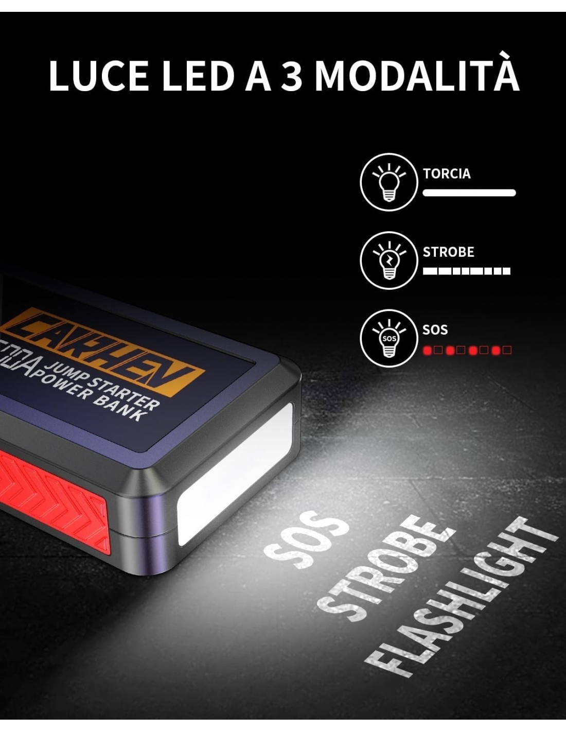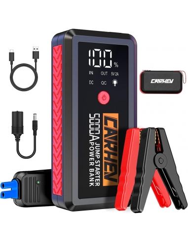 - 【6-IN-1 AVVIATORE DI EMERGENZA 】Il CARHEV Avviatore Batteria Auto al salto di maggiore capacità è dotato di 2 uscite USB (9V/2A e 5V/2A), Può caricare rapidamente il telefono cellulare e altri dispositivi, torce LED integrate con 3 modalità Flash/Strobe/SOS, offrendo la massima comodità e flessibilità. Inoltre, grazie a una porta da 12V/10A, la jump starter può alimentare anche apparecchiature a 12V DC come gonfiatori di pneumatici e aspirapolvere per auto.