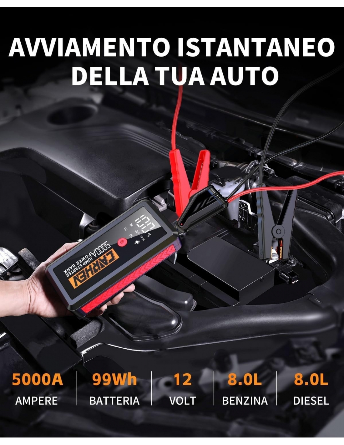 - 【PERFOMANCE SENZA PARI】CARHEV raggiunge una corrente di picco di 5000 Ampere e può avviare qualsiasi veicolo a 12V in pochi secondi [fino a motori a nzina e diesel da 10,0 L], fino a 50 volte con una sola carica. adatto a tutte le auto da 12 V, SUV, camion, motociclette, barche, motoslitte, motoslitte, pickup, ecc.