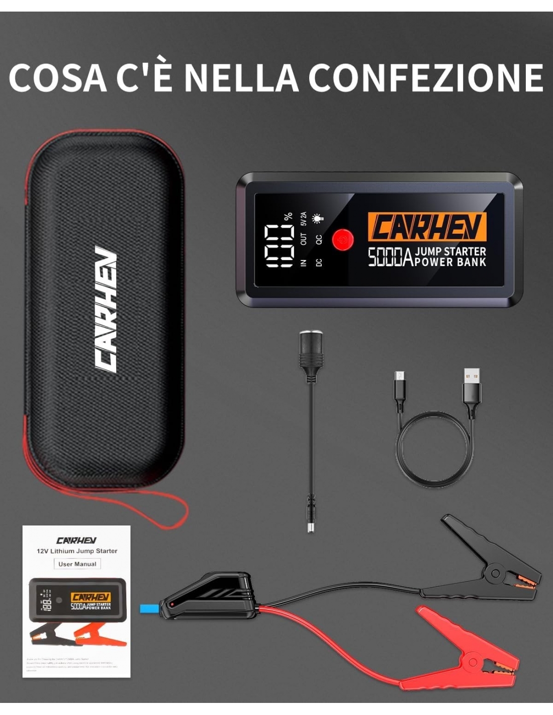 - 【COSA RICEVERAI】CARHEV avviatore batteria auto, Cavo jumper intelligente, Adattatore per accendisigari, Cavo USB, Custodia EVA, Manuale dell'utente in più lingue e 18 mesi di garanzia senza problemi e supporto tecnico a vita, Si prega di contattare noi per aiuto in caso di domande, ti risponderemo entro 24 ore.