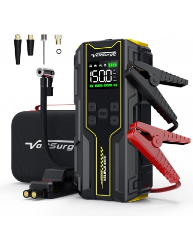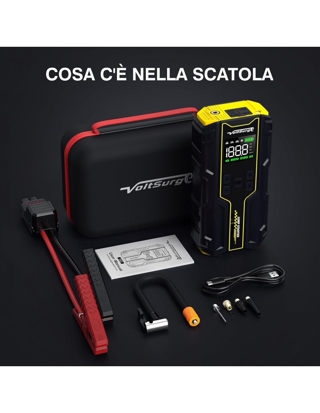 Voltsurge D03 Avviatore Emergenza per Auto, 7000A Booster Avviamento Auto/Moto con Compressore da 150PSI, 12V Avviatore Batteria Jump Starter (Fino a 10L Benzina e 8L Diesel) Display Doppia USB, Torcia a LED