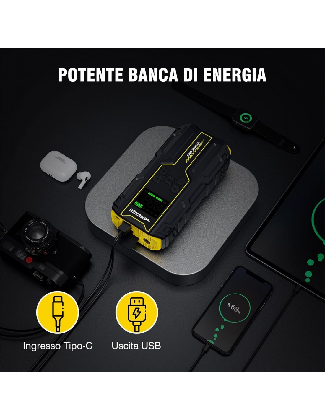 - 🚗【Alimentatore per auto】Questo non è solo un starter batteria auto, ma anche un banca di alimentazione, progettati con 2 uscite USB e un ingresso/uscita di tipo C, puoi caricare completamente cellulari, tablet e altri dispositivi mobili contemporaneamente come supplemento in situazioni di emergenza, in modo da non doversi preoccupare di alimentazione nelle attività all'aperto