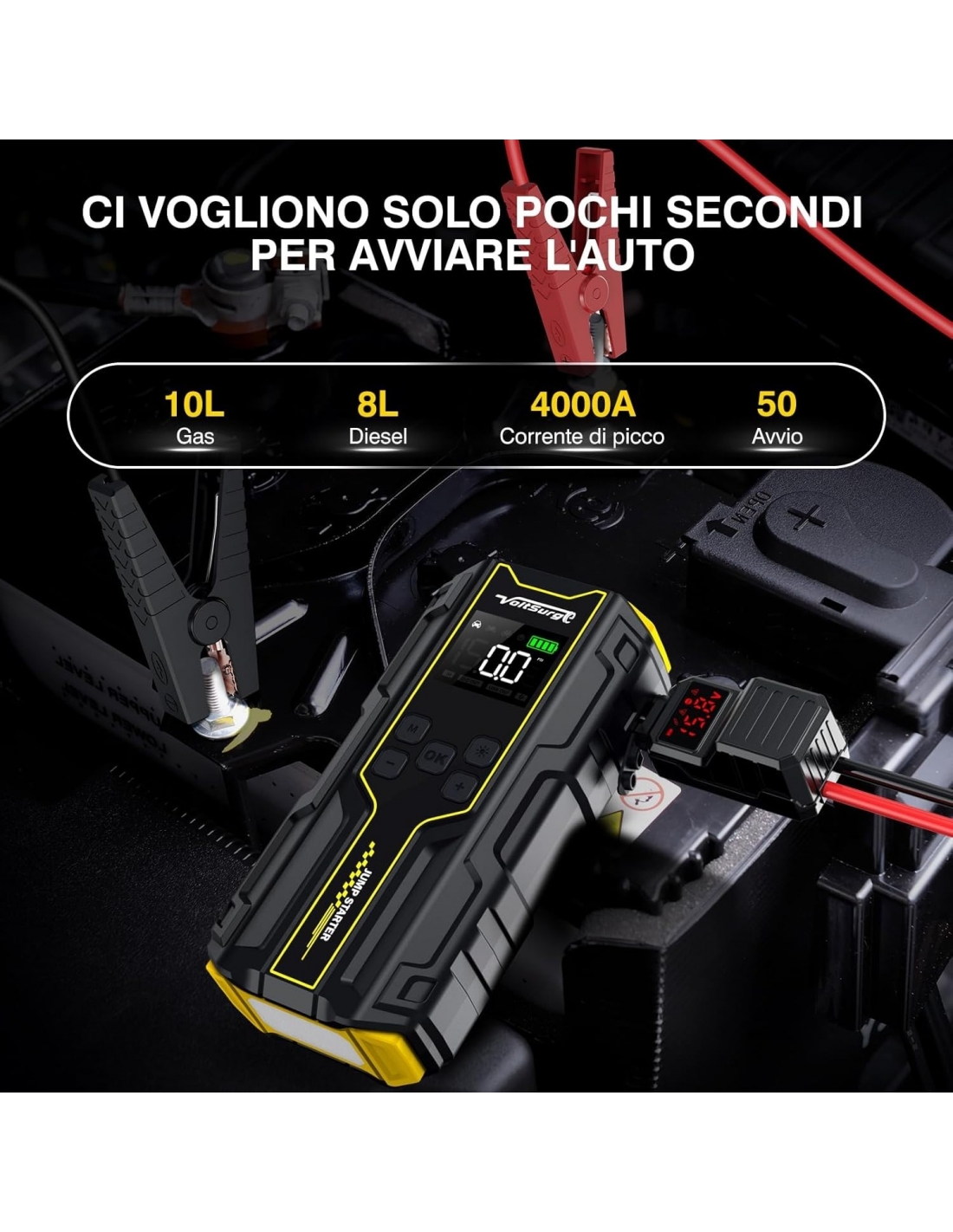 - 🚗【Avviatore Rapido di Auto da 12V】 A partire da una corrente di picco di 7000 A, l'avviatore emergenza per auto con compressore D03 è in grado di avviare immediatamente i veicoli a 12 Volt con motori a benzina fino a 10L o diesel 8L. La sua potente funzione di boost. È adatto a diversi veicoli come auto, SUV, moto, navi e camper. Questo booster può sopportare temperature estreme di -4 ~ 140 ℉