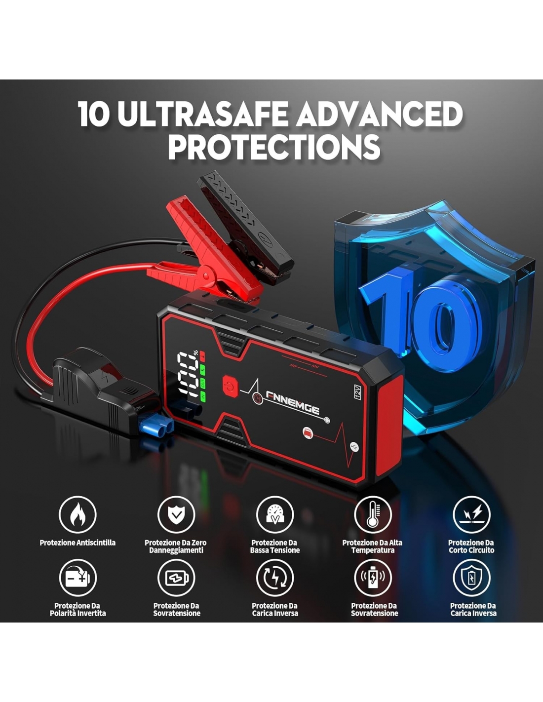- 🚗 【10 PROTEZIONI INTELLIGENTI】 Questo pacco batteria per avviatore è progettato con la sicurezza in mente, dotato di 10 meccanismi di sicurezza intelligenti che proteggono da sovraccarico, cortocircuiti, inversione di polarità, picchi di potenza e scintille. Puoi identificare rapidamente eventuali problemi controllando le spie indicatorie e ascoltando i segnali acustici delle pinze intelligenti.
