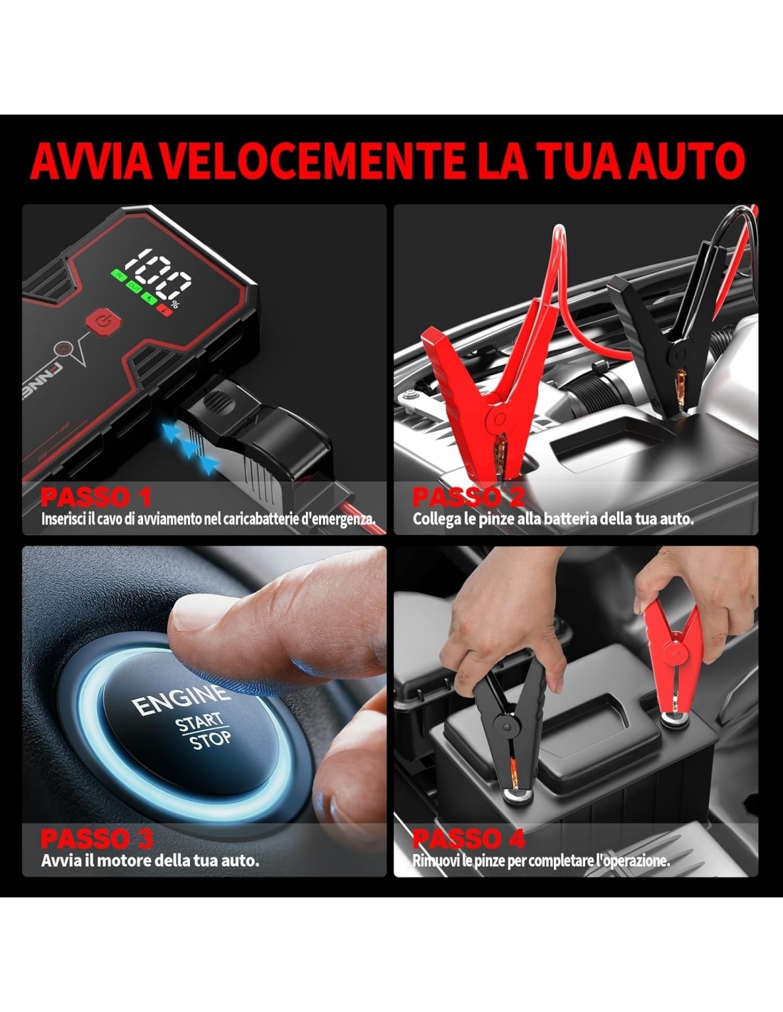 - 🚗 【COSA RICEVI E GARANZIA】 Il pacco avviatore FNNEMGE include: 1 avviatore portatile, 1 set di cavi intelligenti, 1 cavo di ricarica USB-C, 1 scatola di stoccaggio e 1 manuale utente. Offriamo un supporto tecnico di 2 anni e un servizio clienti. Se hai domande durante l'uso, ti preghiamo di contattarci tramite l'indirizzo email fornito nel manuale utente.
