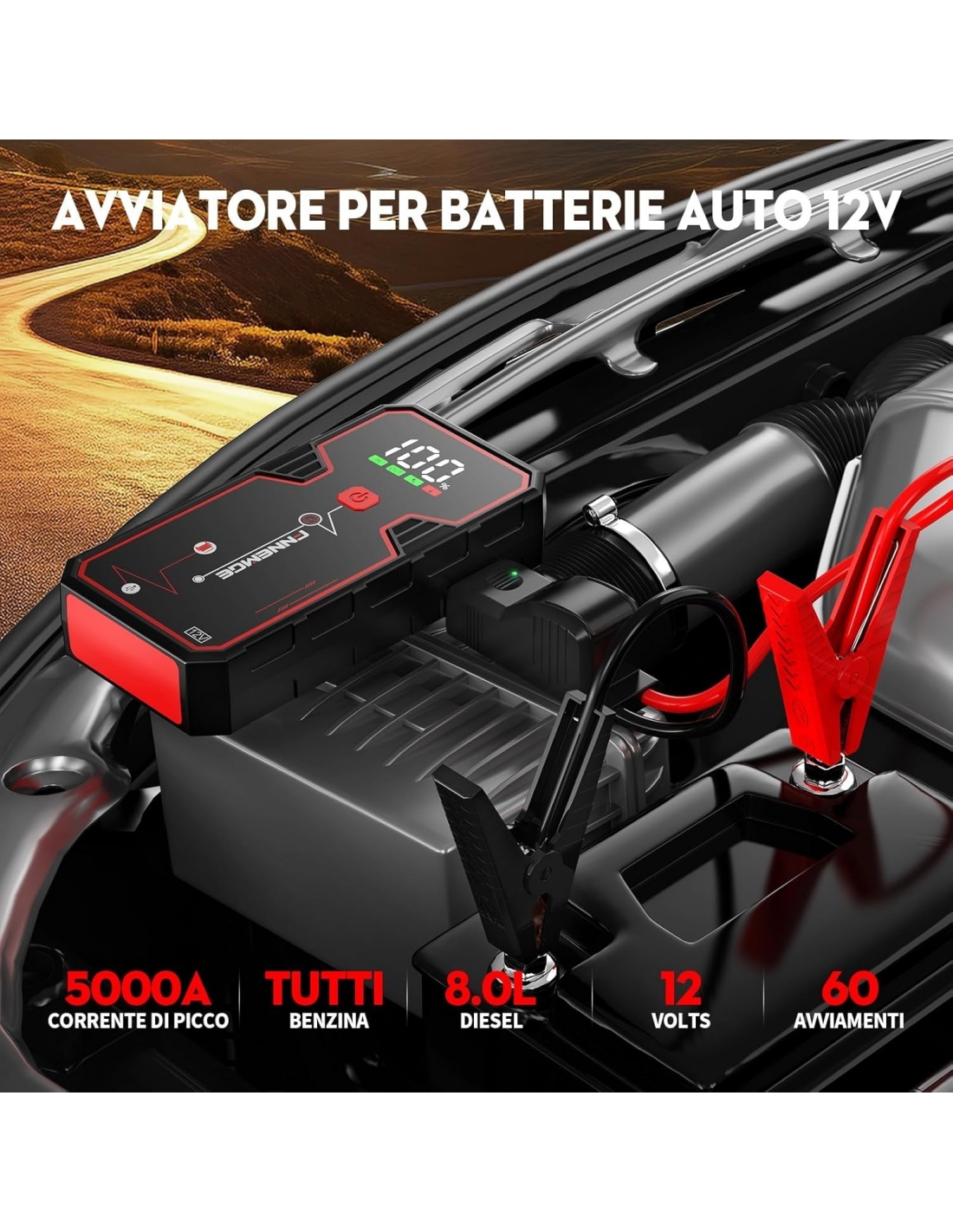 FNNEMGE Avviatore Batteria Auto, 5000A 23800mAh Avviatore Emergenza per Auto(Adatto a Tutti i Veicoli a Benzina o 8,0L Diesel), Avviatore di emergenza, con di Uscita USB, Luce LED, Schermo Grande HD.