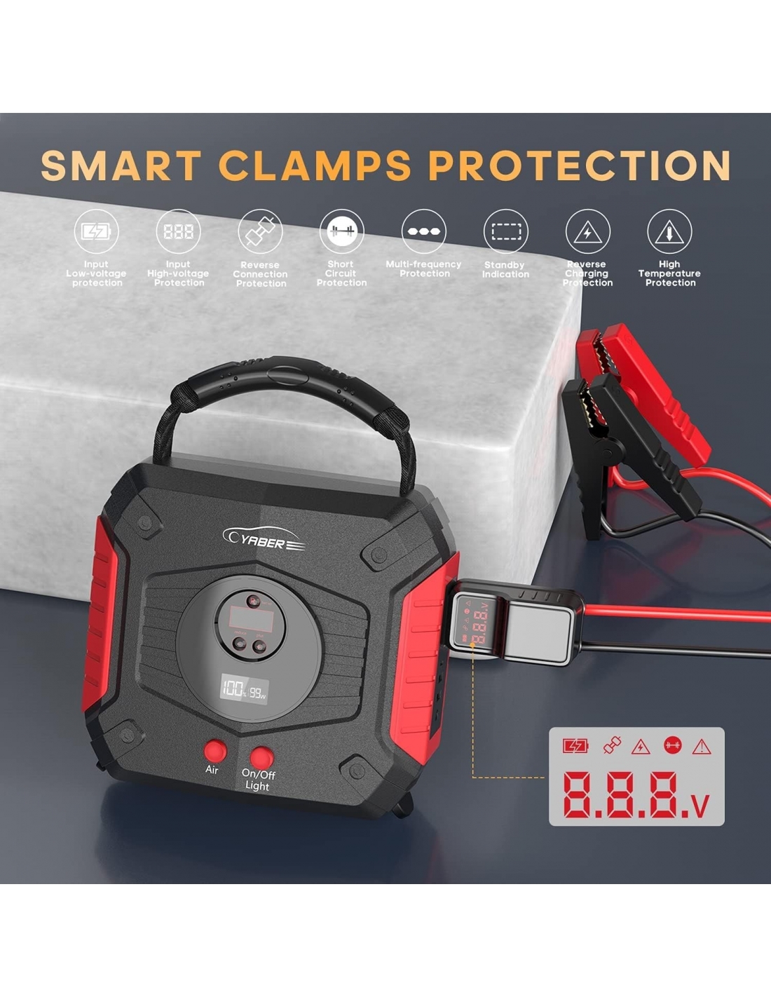 - 【COMPRESSORE PORTATILE DA 150 PSI】Questo avviatore per batteria per auto ha la differenza che questo modello ha anche un compressore integrato da 150 psi. Il compressore può regolare la pressione desiderata e, quando la pressione preimpostata sul pneumatico raggiunge il valore desiderato, viene fornito con 3 adattatori, perfetti per gonfiare pneumatici, palloni, materassi, ecc.