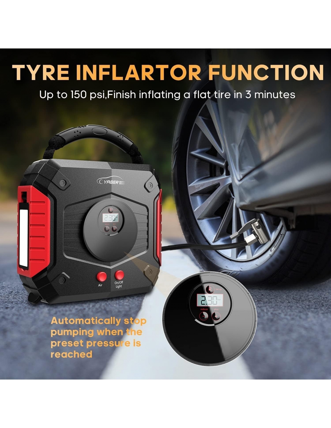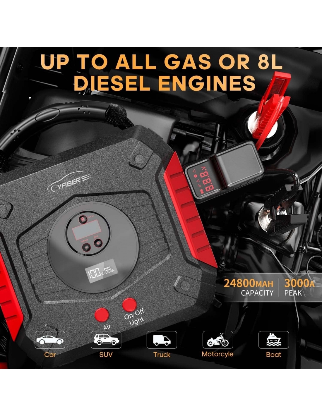 YABER YA80 Avviatore di emergenza per auto 4 in 1, avviatore di emergenza per auto con compressore portatile, avviatore di emergenza per auto da 3000 A (tutti i motori a benzina o diesel da 8 litri), power bank da 24800 mAh con torcia a LED