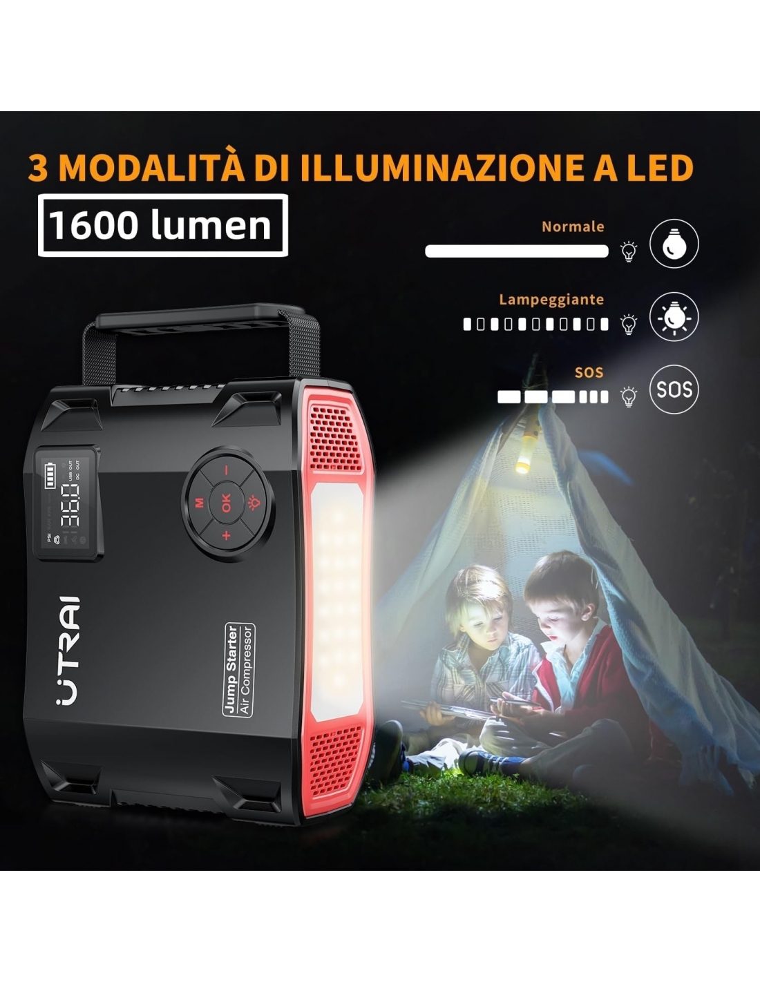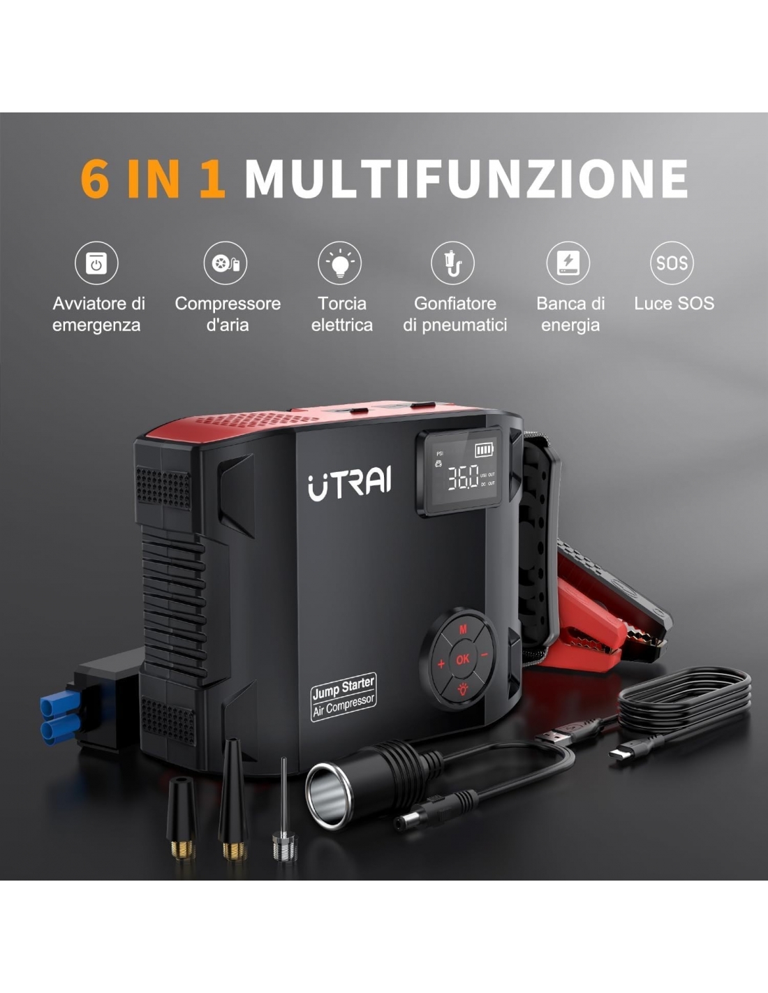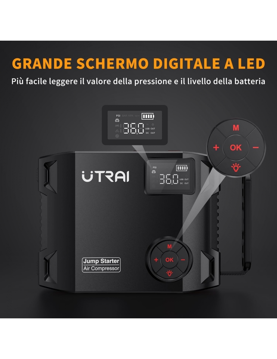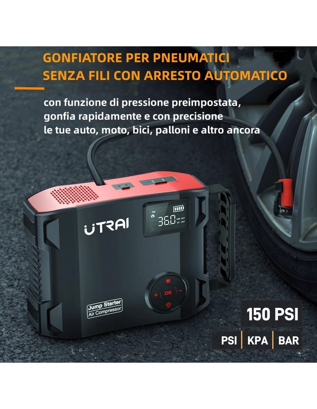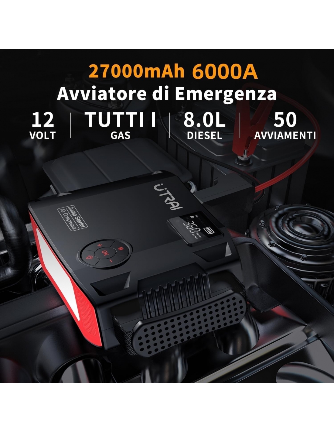 - 🚗 【Aiuto all'avviamento 6 IN 1】UTRAI Avviatore Emergenza con capacità reale 27000 mAh 5000A e pompa dell'aria per auto 150psi, adatto per auto, camion, moto, motoslitte, SUV, ATV, UTV, tosaerba, barche e yacht ecc. (Fino a Tutti i benzina o motore diesel 8.0L))