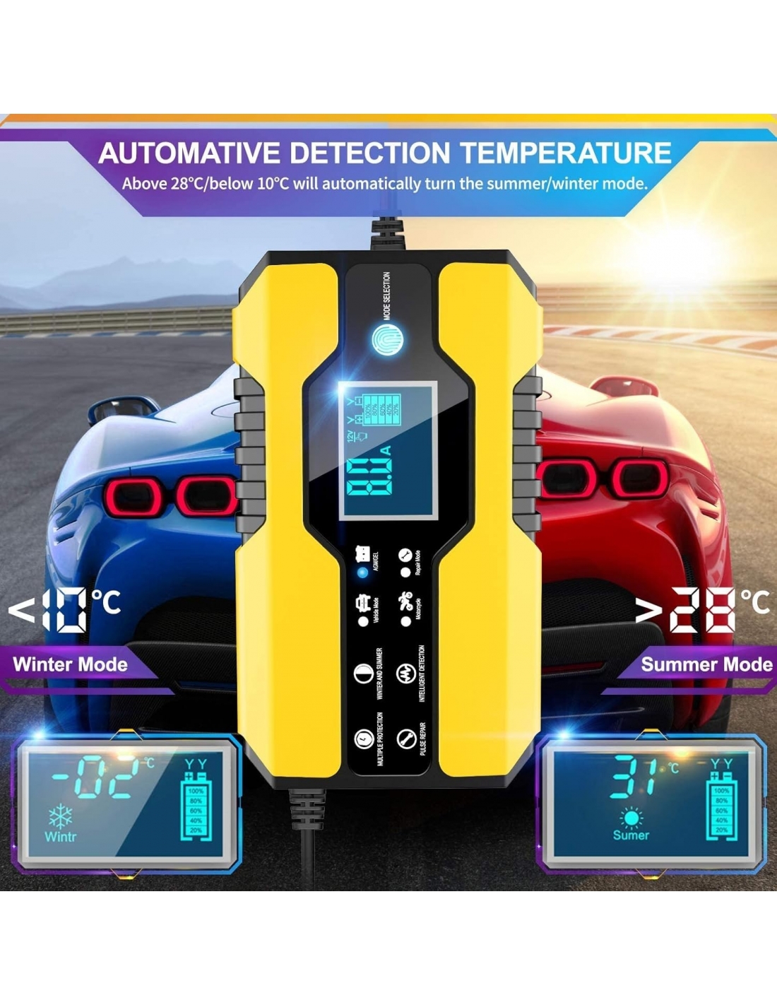 - 🏍️【Ricarica intelligente】Questo caricabatterie da 12 V offre una ricarica in 3 fasi, passando automaticamente dalla carica rapida, alla ricarica completa, quindi alla carica di mantenimento. Rileva la temperatura ambiente, regola automaticamente la corrente e la tensione di carica e commuta automaticamente tra la modalità ESTATE o INVERNO. La batteria può essere caricata perfettamente anche in una varietà di ambienti con tensioni elevate.