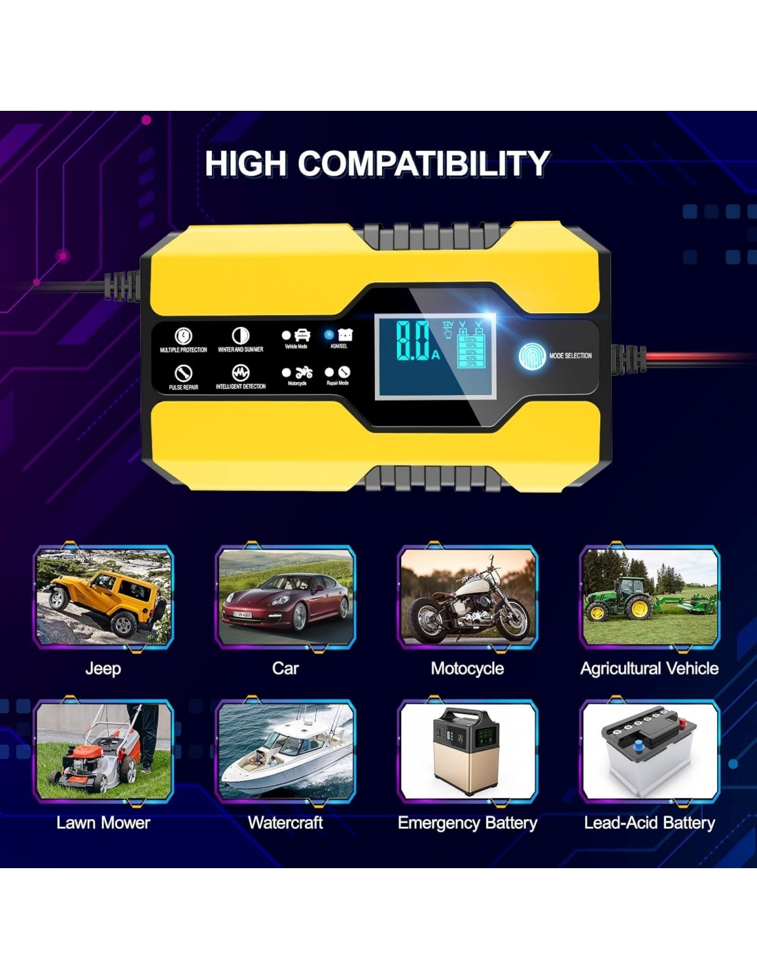 TOKZUVG TSXFQ1208 Caricabatteria per auto 12V 24V 8Amp Mantenitore automatico intelligente Ricarica a 3 stadi 6 modalità di ricarica Funzione di riparazione Adatto per motociclette, barche e tosaerba