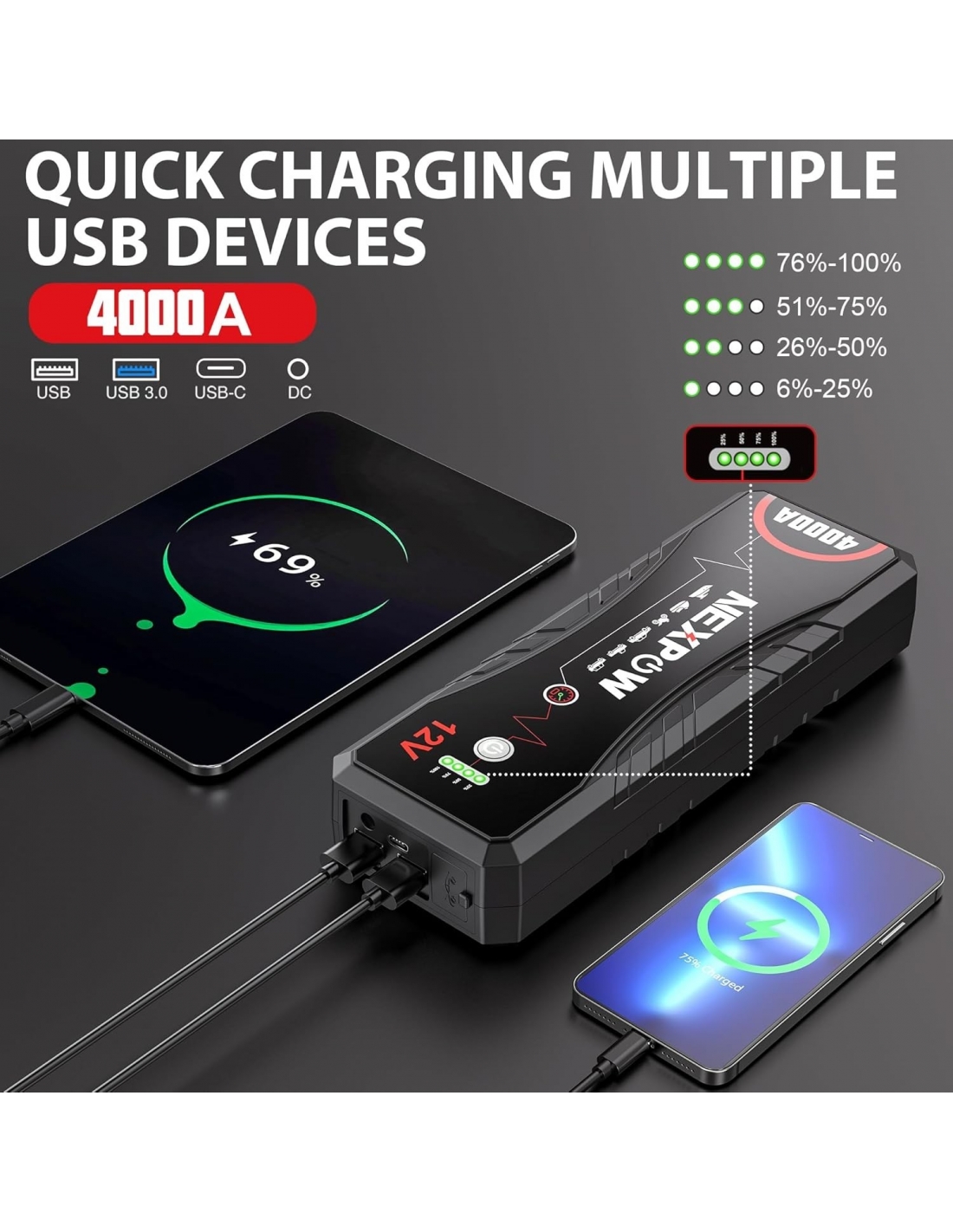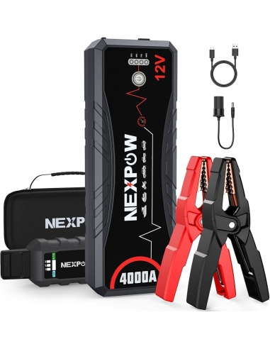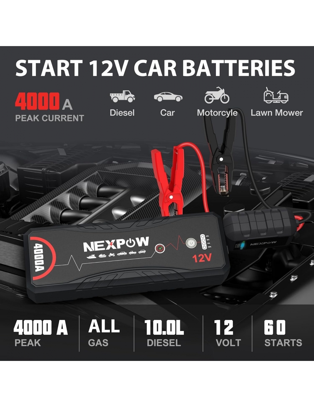 - 【4000A BOOSTER AVVIAMENTO AUTO】NEXPOW avviatore batteria auto con corrente massima di 4000A. Avvia il vostro veicolo a 12v in pochi secondi (7,0 litri di benzina o 5.5 litri di diesel). Ideale per auto, camion, moto, imbarcazioni, camper e trattori. Funziona in sicurezza anche in condizioni estreme (-20℃ ~ +60℃).