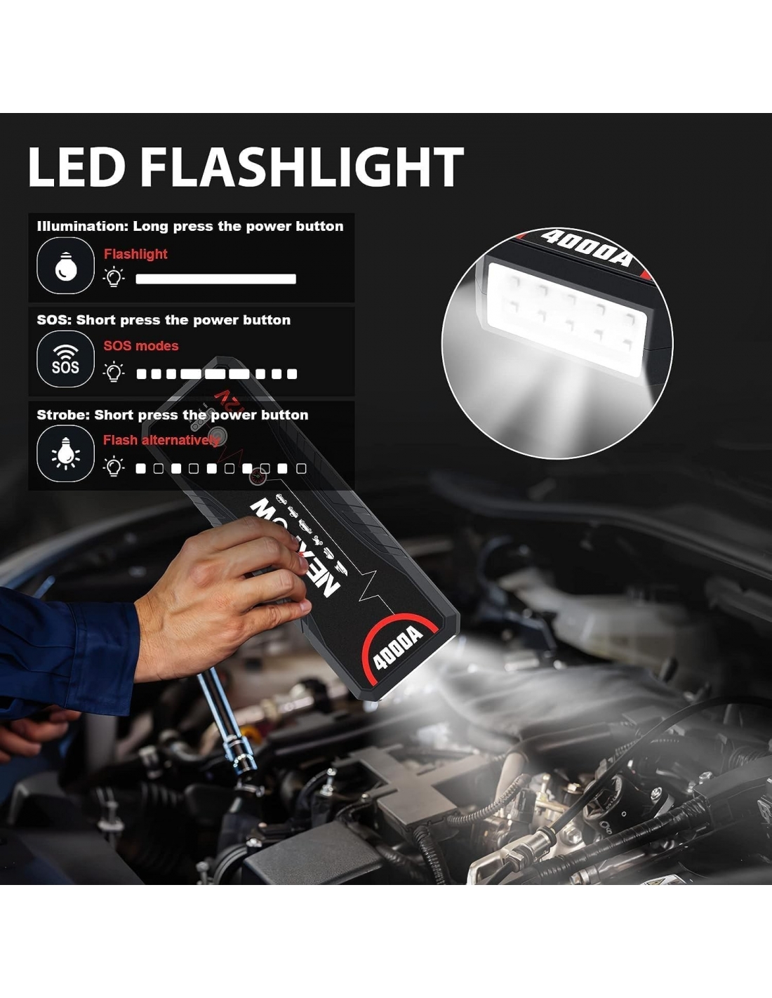 NEXPOW Q11 Avviatore Batteria Auto, 4000A Portatile Booster Avviamento (Fino 7.0L Gas O 5.5L Diesel),12V Avviatore Di Emergenza per Moto, Starter Batteria Auto Con Torcia a LED&USB, Cavo Di Avviamento