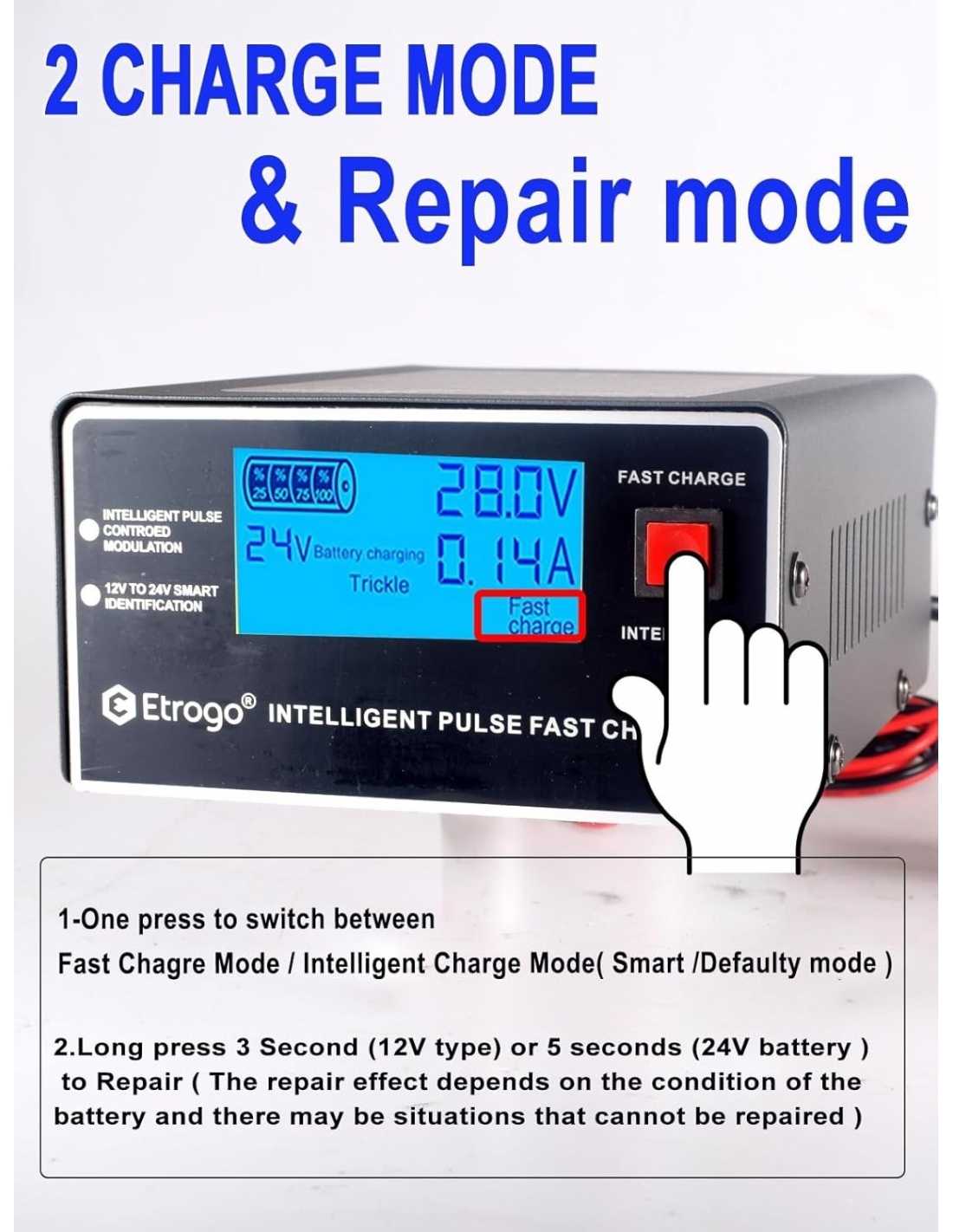 - Due modalità di ricarica: la modalità di ricarica "intelligent" è adatta per caricare la batteria o mantenerla in condizioni normali. La modalità di ricarica rapida "Fast Charger" è adatta per batterie scariche a bassa temperatura o per lungo tempo. Dopo che la ricarica rileva che la batteria è completamente carica, il caricabatterie interromperà automaticamente la ricarica con un allarme acustico, indipendentemente dalla modalità di ricarica salvata