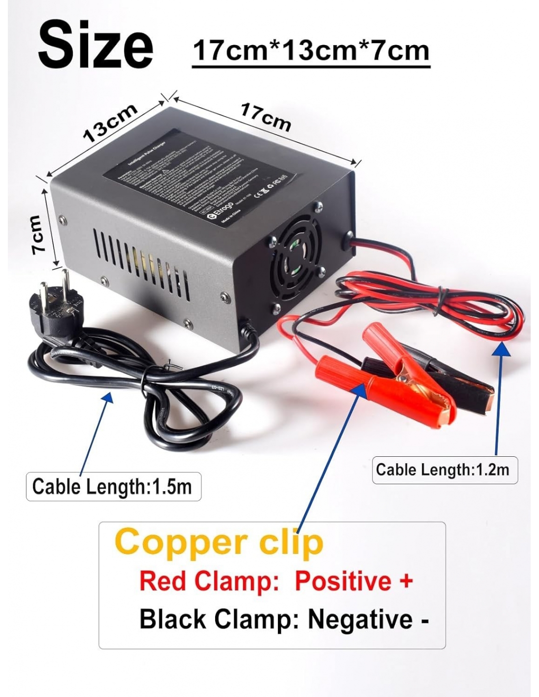 - Caricabatterie a impulsi: ventola di raffreddamento integrata integrata per un'efficace dissipazione del calore e risparmio energetico. Spessa clip a coccodrillo in rame anodizzato, che riduce l'ossidazione della clip da parte dell'aria, prolungando la vita della clip; La clip di rame serve per collegare la batteria, quella rossa è collegata al positivo (+) e quella nera è collegata al negativo (-) (Nota: lunghezza della linea di ingresso; 150 cm, lunghezza della linea di uscita : 120cm)