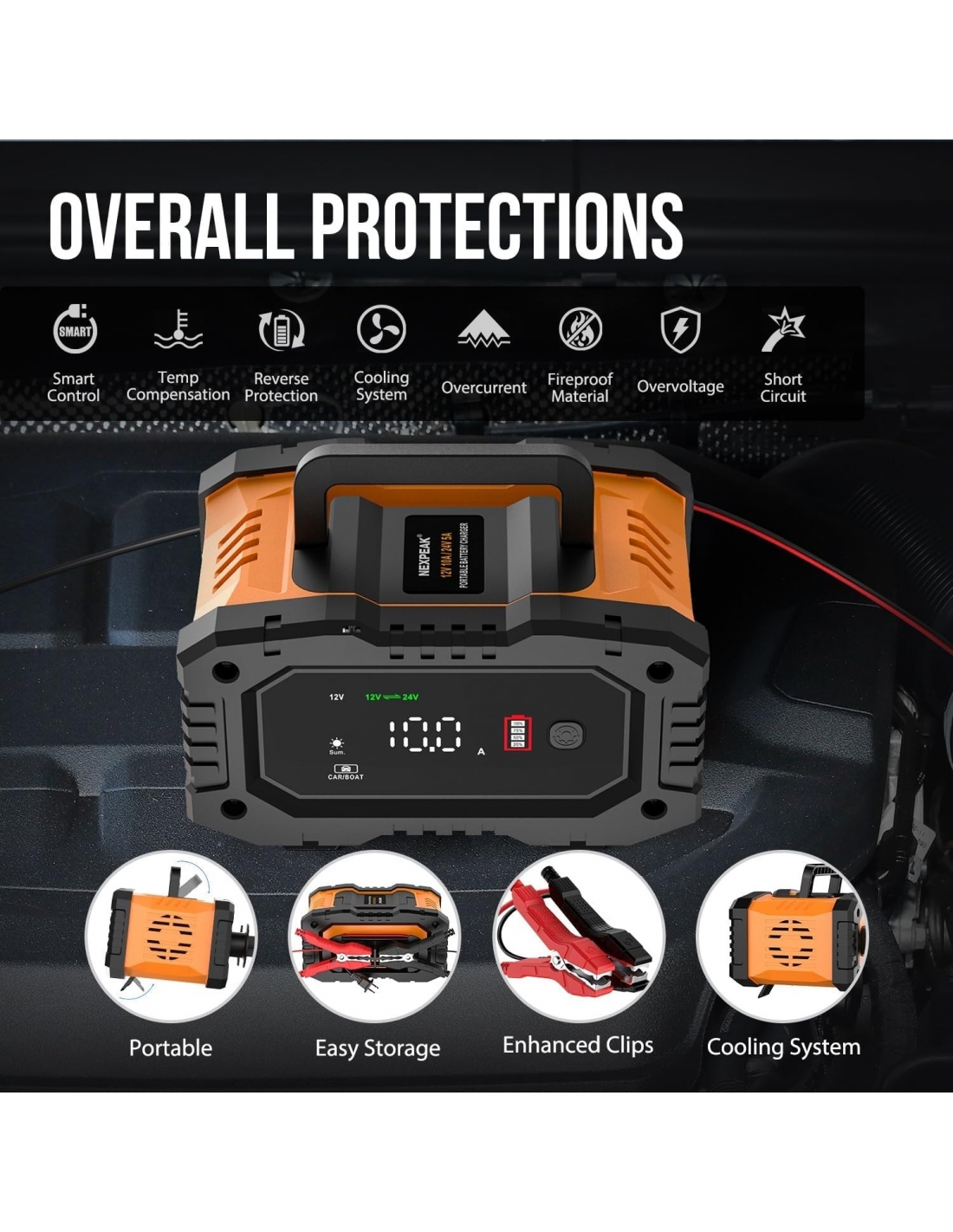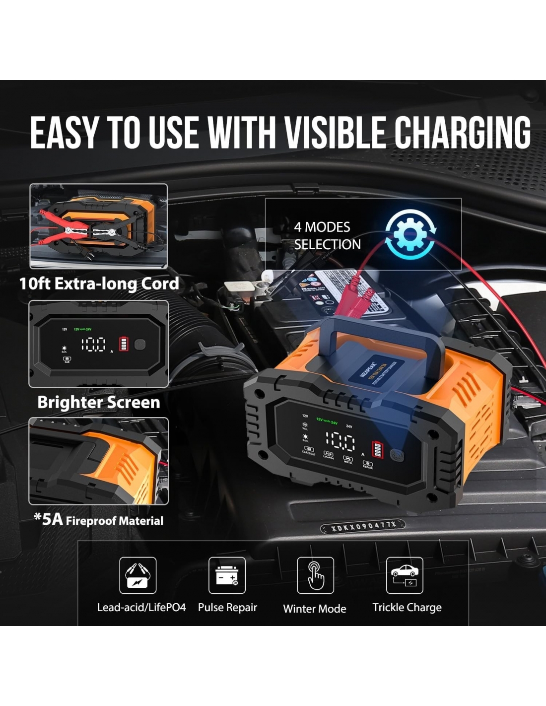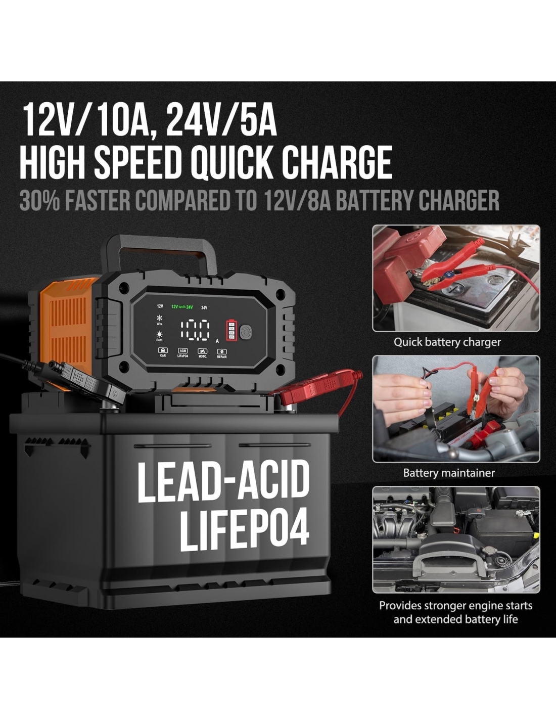 - 【CARICATORE LiFePO4】Caricabatterie per auto 12V 10A e 24V 5A, la velocità di ricarica è molto più veloce rispetto ai caricabatterie automatici da 8A. I caricabatterie per auto caricano o riparano tutte le batterie LiFePO4 o al piombo-acido da 12 V e 24 V per autoveicoli, marine e a ciclo profondo, comprese AGM, GEL, SLA, batterie anti-inondazione in auto, camion, SUV, motociclette, tosaerba, barche, ecc. NUOVO SOSTITUZIONE DISPONIBILE PER QUALSIASI PROBLEMA DI QUALITÀ.