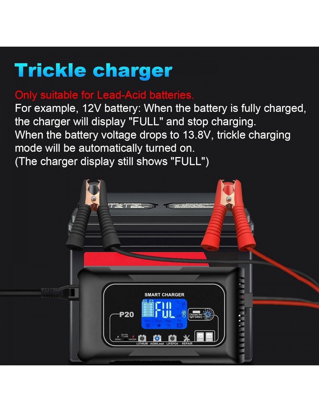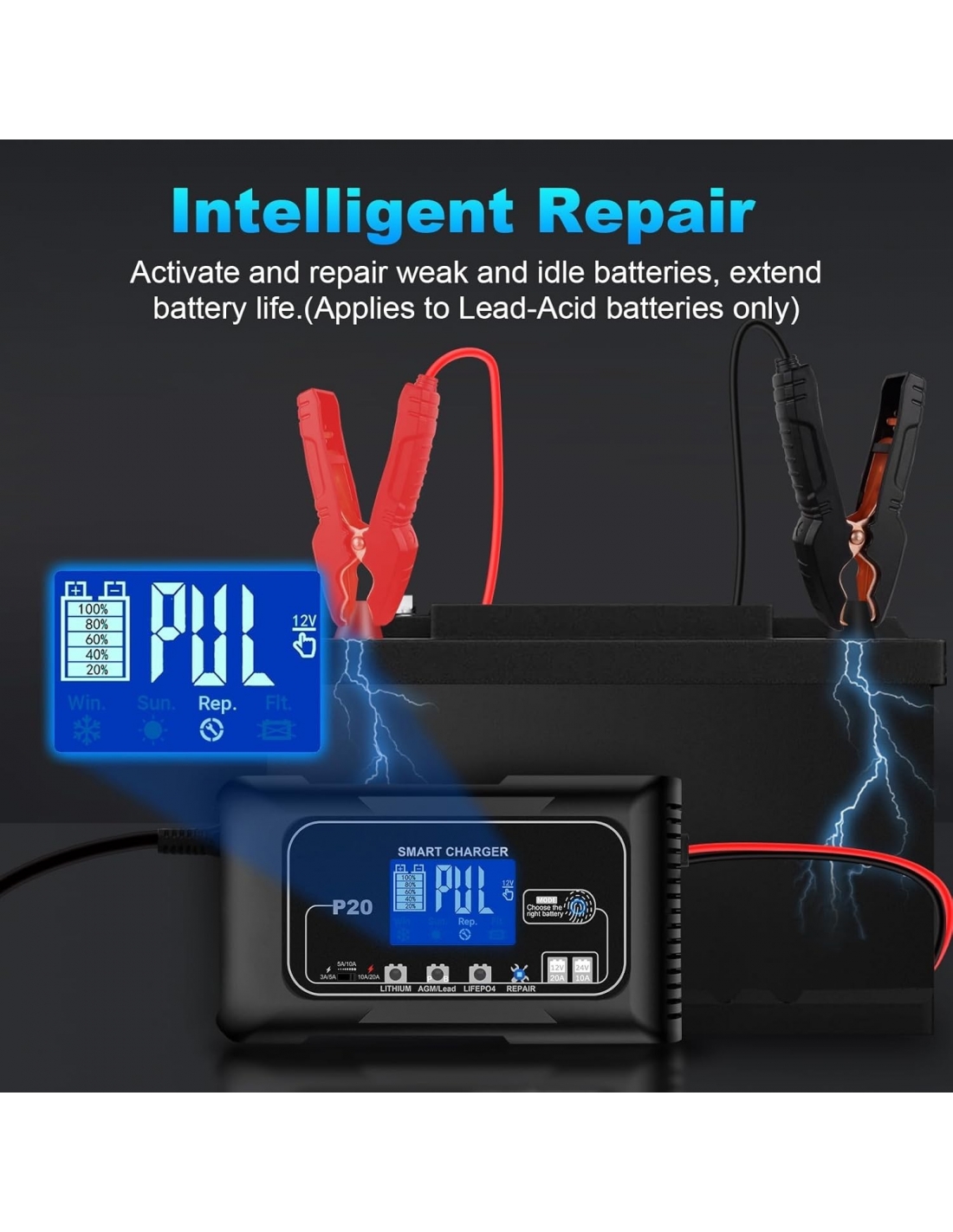 - 【Mantenitore di carica auto】Le unità di ricarica della batteria per auto utilizzano la ricarica automatica a 9 fasi, incluso il rilevamento della batteria, la desolforazione, la carica di mantenimento, ecc. per ottenere la ricarica migliore e più efficiente. La modalità riparazione viene utilizzata per riparare e attivare batterie vecchie e deboli.