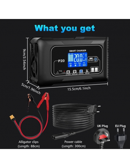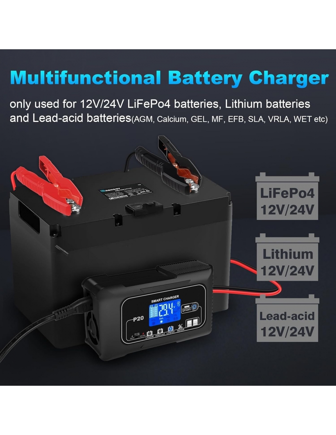 - 【Facile da usare】Il carica batterie 12V/24V ha 3 livelli di regolazione della corrente e può passare tra 4 modalità di ricarica con un clic. Con lo schermo LCD, visualizza la tensione della batteria, la corrente di carica, la temperatura di carica, la batteria piena, ecc. Il caricabatteria per auto regola automaticamente la potenza di carica in base alla temperatura ambiente.