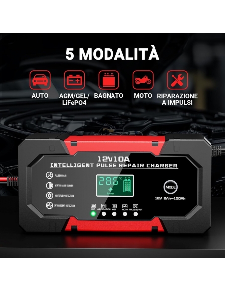 • Riparazione intelligente degli impulsi: il riparatore di batterie 12V10A è dotato di una funzione avanzata di riparazione degli impulsi, che rileva in modo intelligente lo stato della batteria e ne massimizza la durata. Nota: non adatto per batterie completamente scariche o gravemente danneggiate