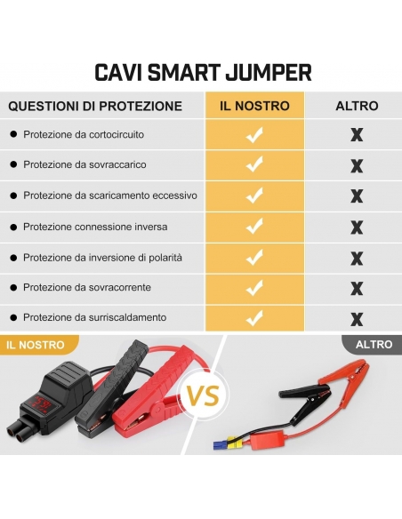 - 8 sistemi di protezione intelligenti Questo potenziatore di batterie è dotato di 8 sistemi di protezione intelligenti: cortocircuito, sovraccarico, sovrascarico, inversione di connessione, inversione di polarità, sovracorrente, alta temperatura, inversione di carica. L'indicatore appositamente progettato avverte l'utente dell'uso improprio con un ronzio sonoro e luci lampeggianti.