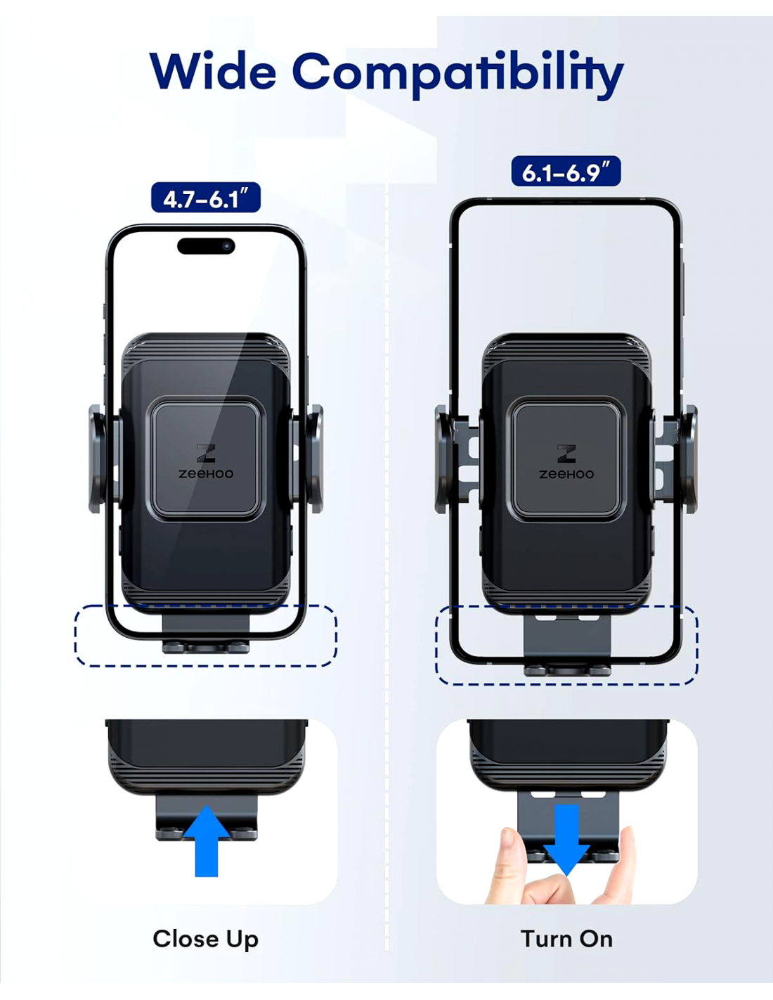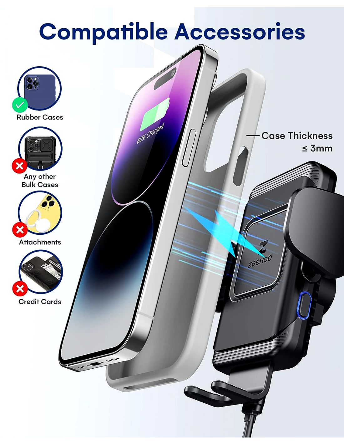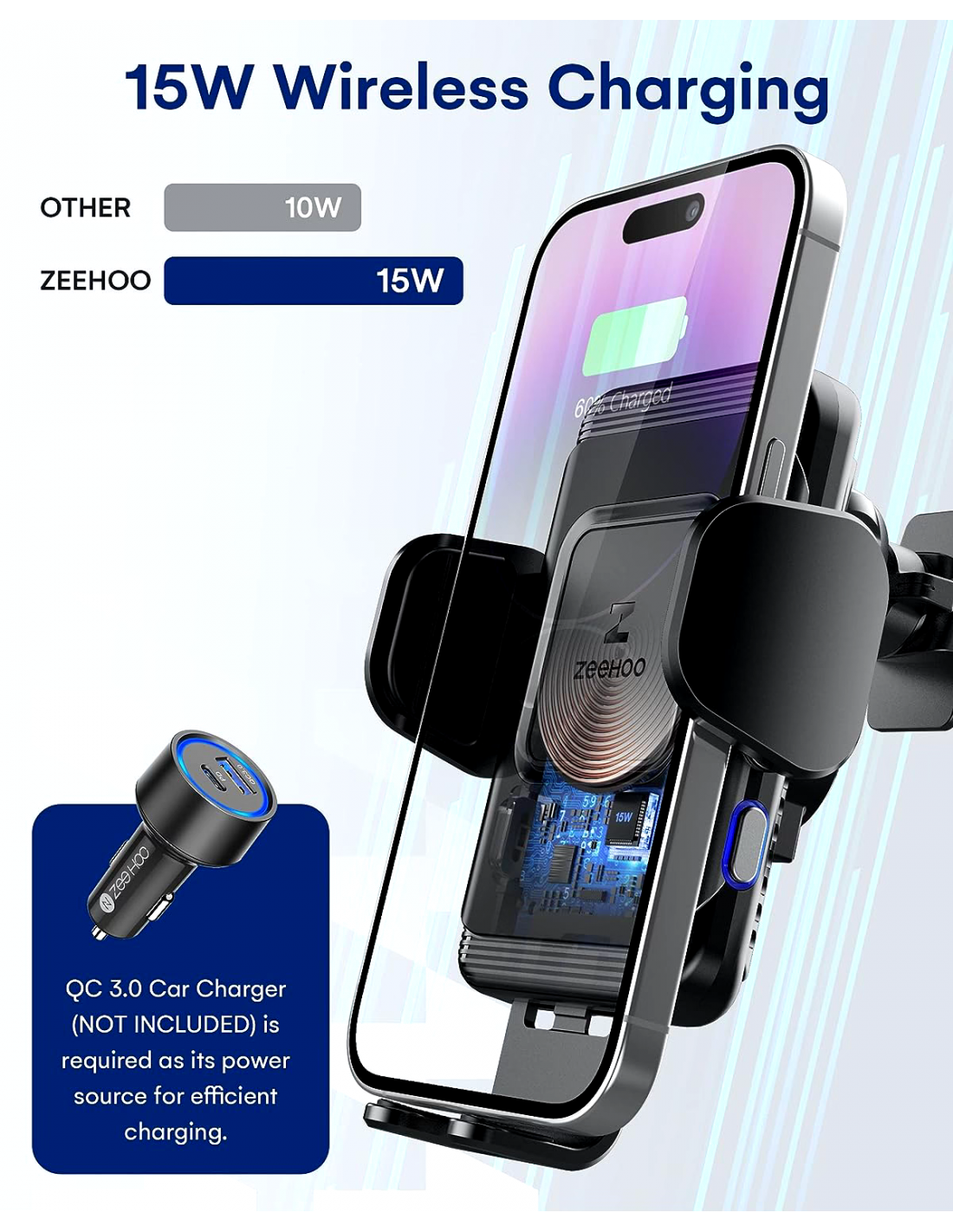 Caricabatterie wireless veloce Qi da 15 W 2-IN-1 Design combina il caricabatterie wireless Qi e un supporto per telefono per auto. Il caricabatterie wireless per auto offre una ricarica rapida per i tuoi telefoni e ti salva dal pasticciare con cavi e custodie durante la guida. Potrebbe fornire una ricarica rapida Max 15W. Per una modalità di ricarica efficiente, è necessario l'adattatore per caricabatterie per auto QC 3.0 come fonte di alimentazione. L'adattatore per caricabatterie per autoZEEHOO 45W è CONSIGLIATO (incluso nella confezione)