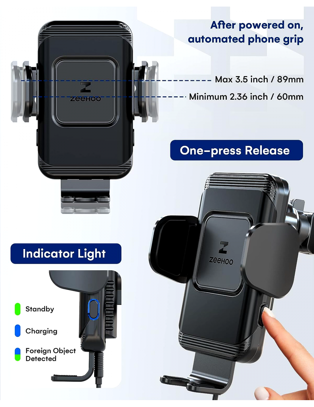 2 IN 1: il caricabatterie wireless e il supporto del telefono sono combinati come uno, alimentano il tuo dispositivo senza la necessità di cavi disordinati all'interno del tuo veicolo. Mentre metti il telefono all'interno, i morsetti si adattano automaticamente al tuo telefono con una presa sicura. Pulsante touch intelligente e indicatore LED su entrambi i lati, induzione completamente automatica, funzionamento con una sola mano.
