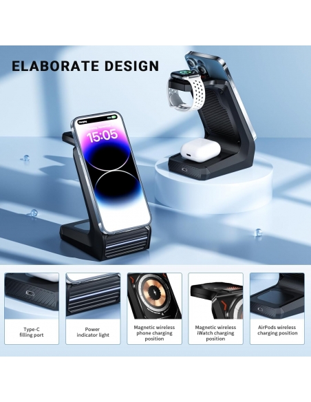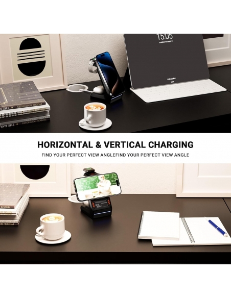 - Base di Ricarica 3 in 1: con questa stazione di ricarica wireless all-in-one con stazioni di ricarica speciali per iPhone, Apple Watch e AirPods/AirPods Pro, puoi facilmente ricaricare tutti i tuoi accessori quotidiani in un unico posto centrale. Dì addio ai cavi aggrovigliati e goditi la ricarica wireless semplicemente mettendo il telefono sulla base di ricarica, niente più problemi di collegamento e scollegamento.