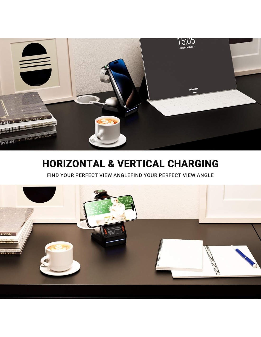 - Ricarica rapida e dissipazione del calore: nessun surriscaldamento, nessun danno! Sblocco di sicurezza ricarica rapida con questo telefono e orologio caricabatterie in piedi, come è dotato di un adattatore rapido certificato QC 3.0 18W e dotato di molti fori di dissipazione del calore sul retro, raffreddare il telefono e mantenere la velocità di ricarica al massimo garantendo una ricarica stabile e veloce, che è il 30% più veloce rispetto ad altri caricabatterie wireless.