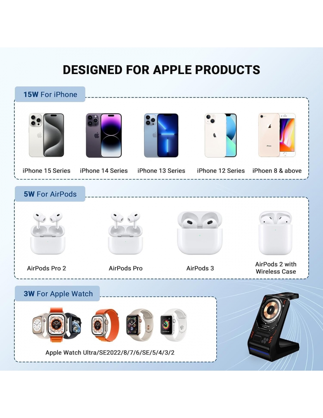 LTLIUU Caricabatteria Stazione wireless 3in1 Apple 15W iPhone iWatch Auricolari