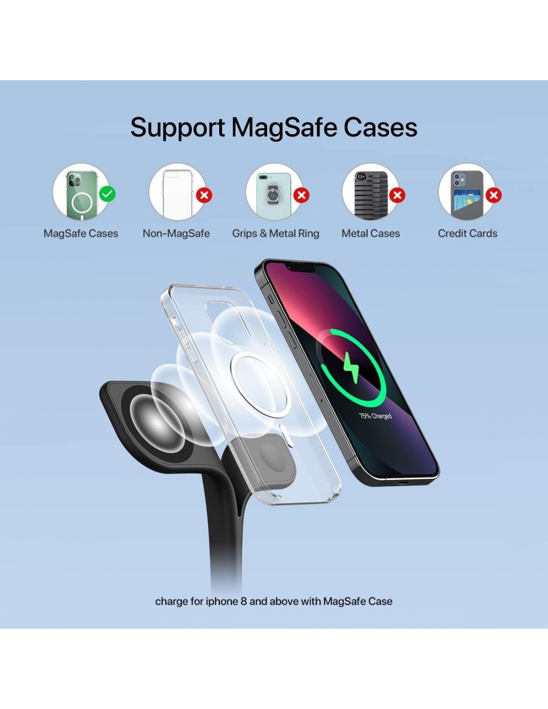 - ICompatibile con il caricabatterie MagSafe, il caricabatterie wireless ricarica rapidamente i dispositivi Apple (adattatore QC 3.0 incluso). Il caricabatterie magnetico per iPhone ha un'uscita fino a 10 W; l'uscita per gli auricolari è di 5 W; 3 W standard per iWatch. (Nota: si consiglia un'alimentazione in ingresso fino a 18 W, altrimenti la ricarica wireless di più dispositivi potrebbe risultare insufficiente o instabile).