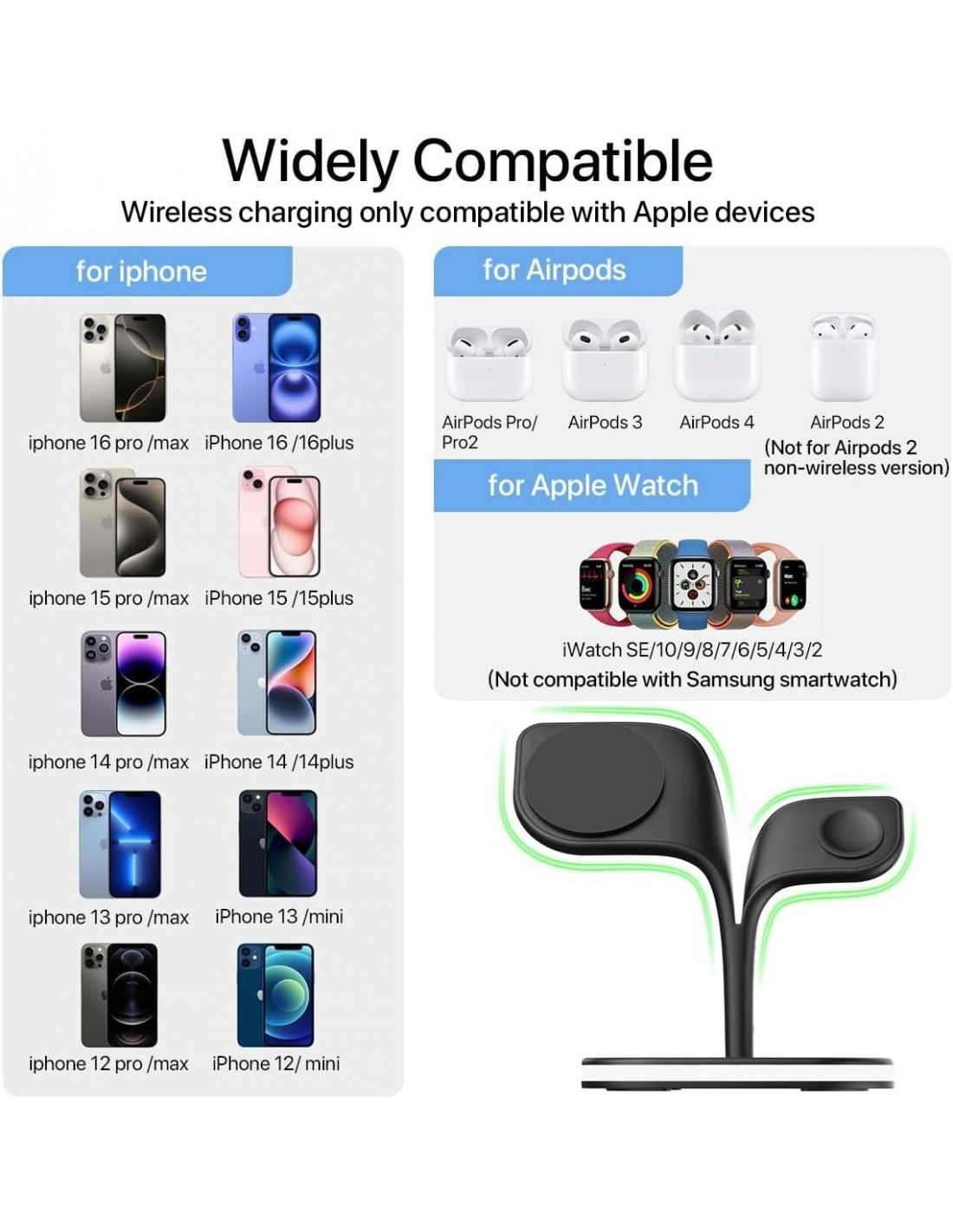 - Ispirata alle foglie verdi della natura, la forma unica di questa stazione di ricarica wireless per Apple ti offrirà praticità e ti manterrà di buon umore!