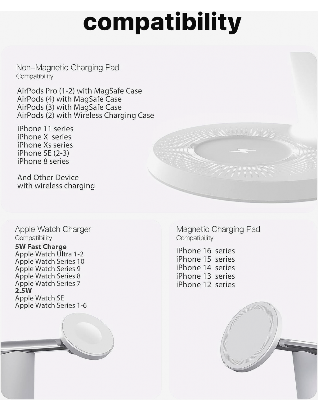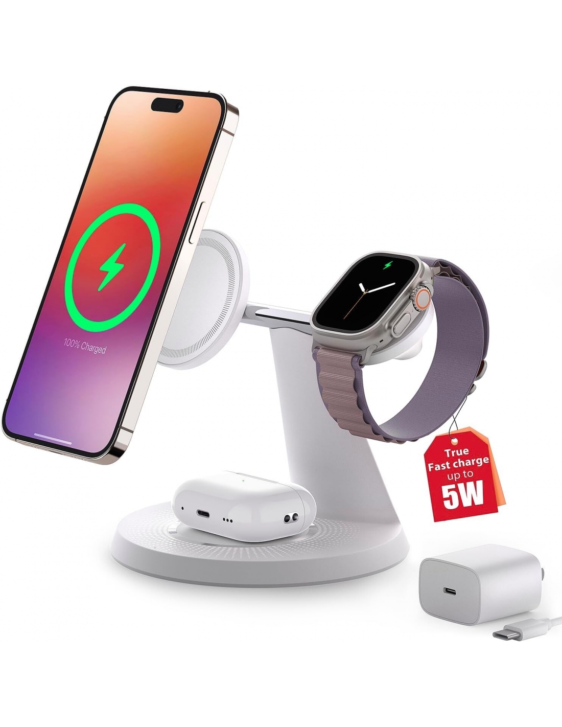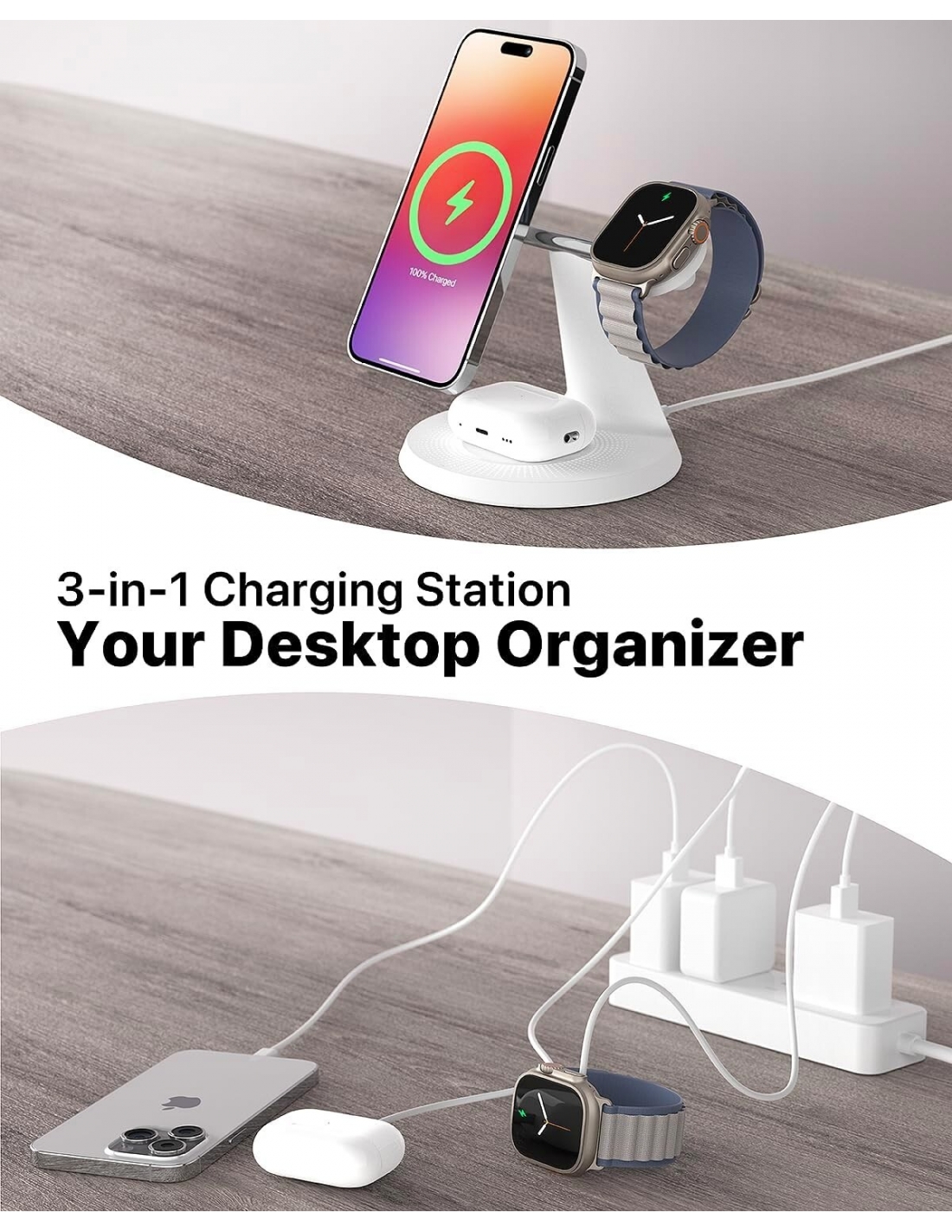- Stazione di ricarica 3 in 1 per dispositivi Apple: ricarica iPhone, Apple Watch e AirPods contemporaneamente. Può anche caricare due telefoni e un Apple Watch contemporaneamente. Elimina l'ingombro dei cavi e mantieni la scrivania in ordine.