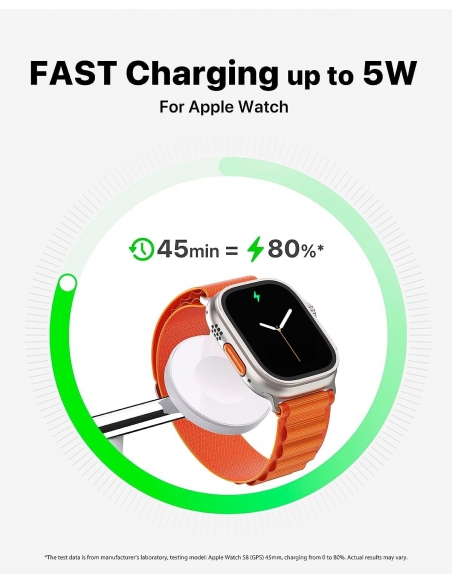 - Ricarica rapida per Apple Watch: caricabatterie per Apple Watch fino a 5 W. Ricarica Apple Watch 9 fino all'80% in soli 45 minuti: ideale per una ricarica rapida prima di andare a letto, assicurandoti che monitori il tuo sonno per tutta la notte.