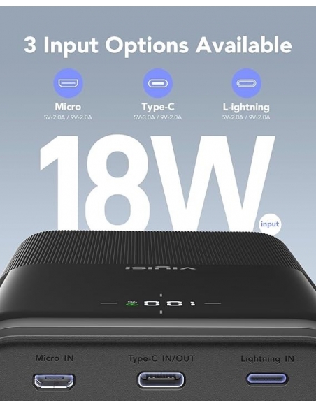 【3 opzioni di ricarica】Soddisfacendo le esigenze della maggior parte degli utenti sul mercato con ingressi Micro, USB-C e Lighting, la batteria portatile può essere ricaricata utilizzando il caricabatterie del telefono. Si consiglia di utilizzare un caricabatterie con una potenza superiore a 18 W per caricare il power bank più velocemente. (Il caricabatterie non è incluso)