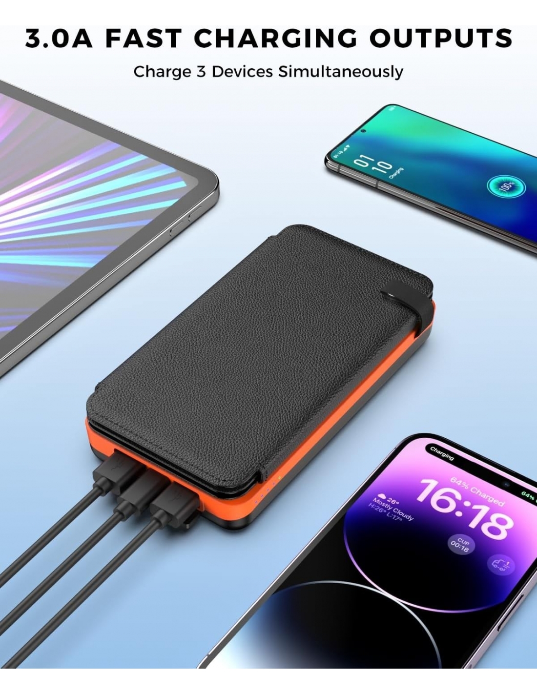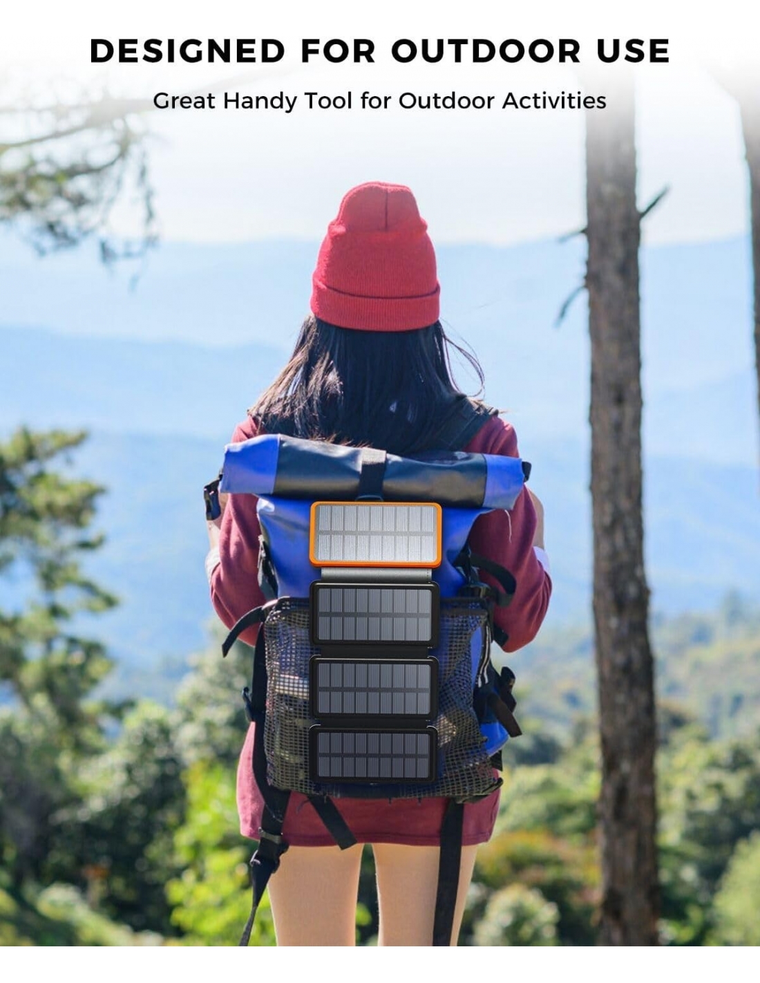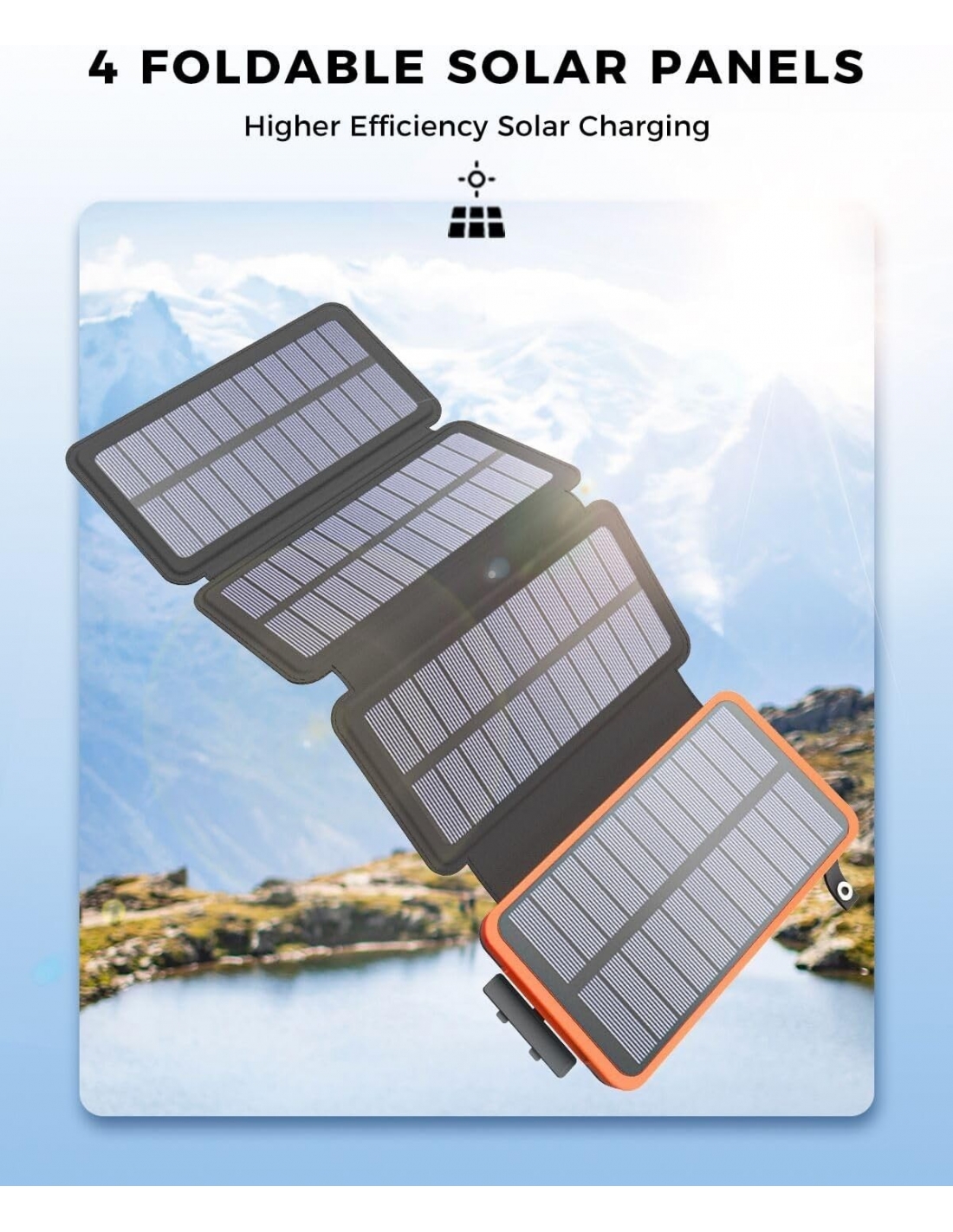 - ESSENZIALE ESTERNO: questo power bank solare è dotato di una luce LED, che lo rende una scelta pratica per illuminare le aree buie in campeggio o in viaggio. Il suo design resistente protegge da pioggia, sporco e cadute.