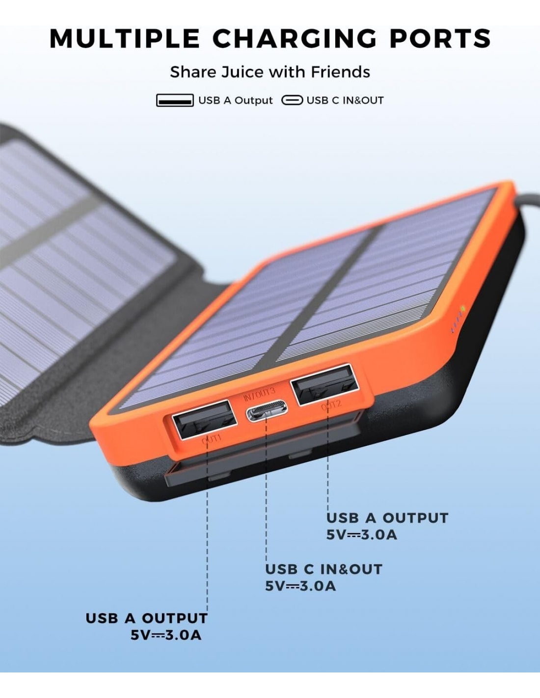 - RICARICA VELOCE: Grazie alla tecnologia intelligente, questo caricabatterie solare ottimizza la velocità di ricarica dei dispositivi, riducendo notevolmente i tempi di ricarica. Dispone di tre porte USB da 3A, 2 uscite USB A e 1 ingresso e uscita USB C, che consentono la ricarica simultanea di 3 dispositivi e la compatibilità con la maggior parte di telefoni e tablet.