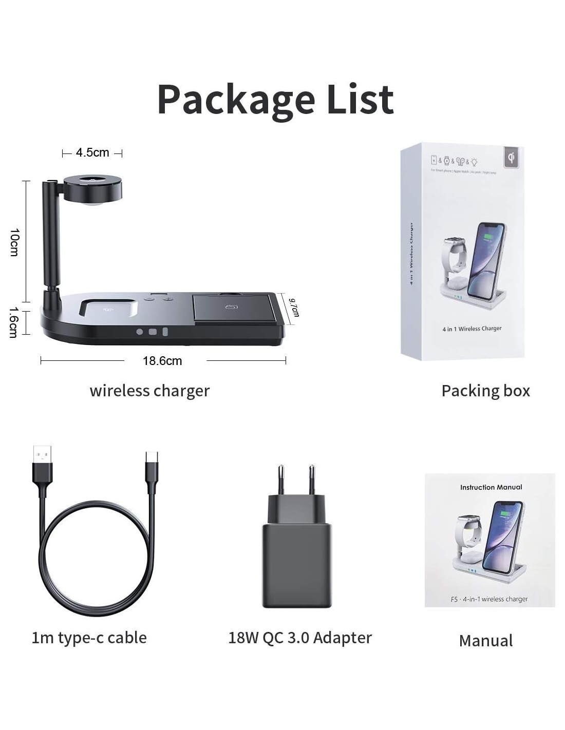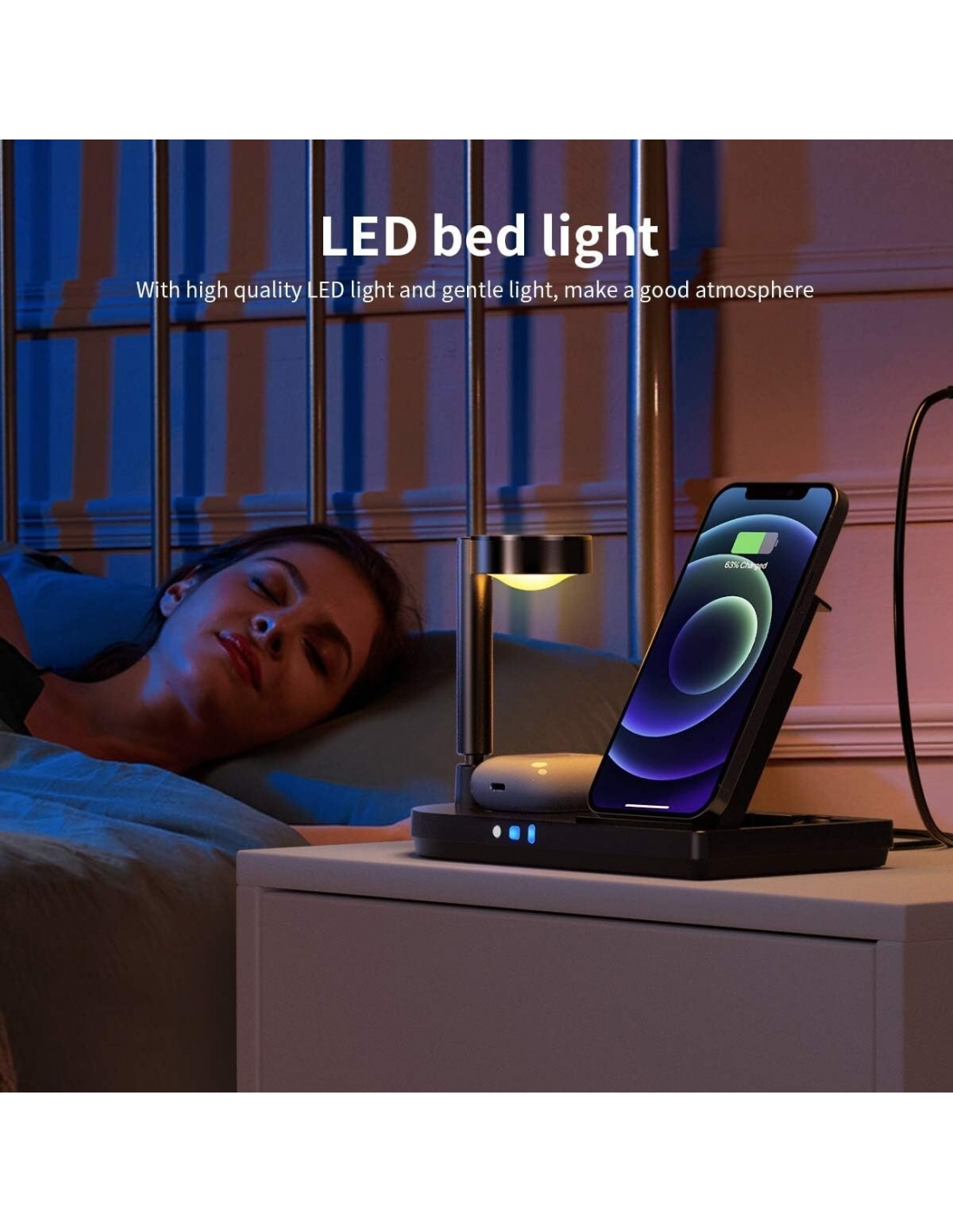 [Stazione di ricarica wireless 4 in 1] Il caricabatterie wireless progettato con una lampada da comodino per la cura degli occhi, supporta la ricarica USB. Supporta la ricarica rapida da 15 W per Samsung S20 / S10 / S9 / S8 / S7 / Note10 / 9/8 Series, la modalità di ricarica da 7,5 W del supporto di ricarica Compatibile con iPhone 12/11 / 11pro / XS Max / XS / XR / X / 8 Plus / 8 e la modalità di ricarica da 5 W per Apple Watch SE / 6/5/4/3/2/1 e AirPods 2 / pro.