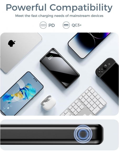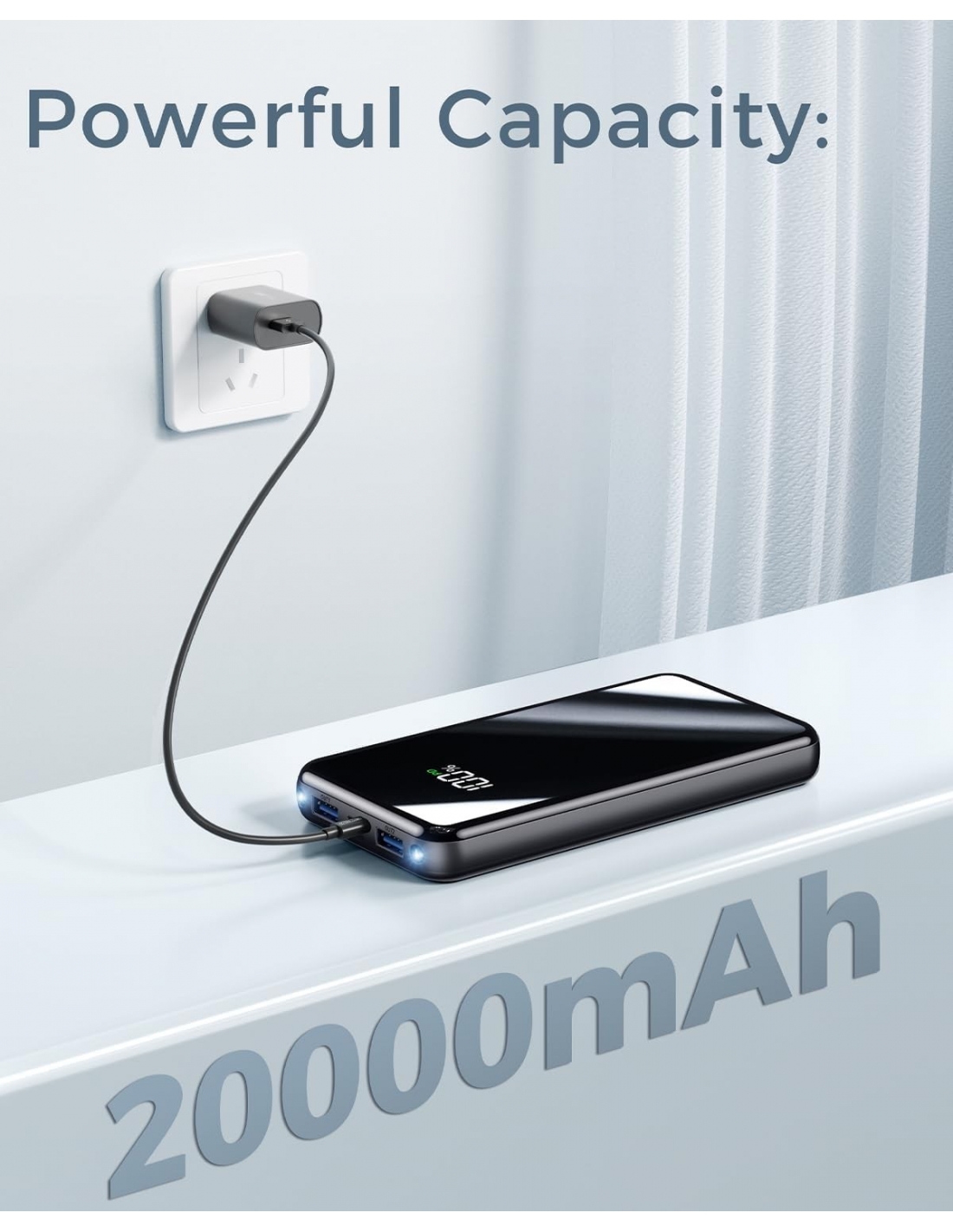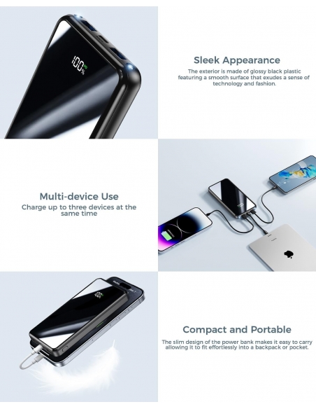 - Alta capacità: questo power bank ha una capacità di ben 20.000 mAh, consentendoti di ricaricare più smartphone più volte. Che tu sia in viaggio o semplicemente impegnato nella tua routine quotidiana, assicura che i tuoi dispositivi rimangano carichi per tutto il giorno. Di' addio all'ansia da batteria scarica e rimani connesso ovunque tu sia.