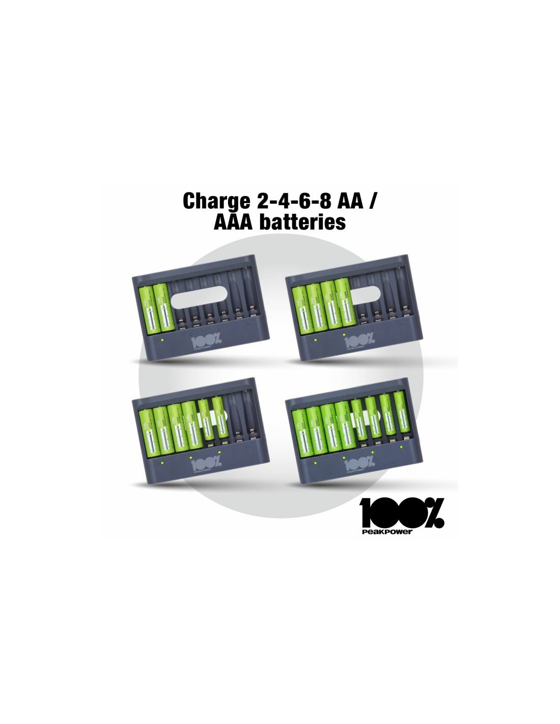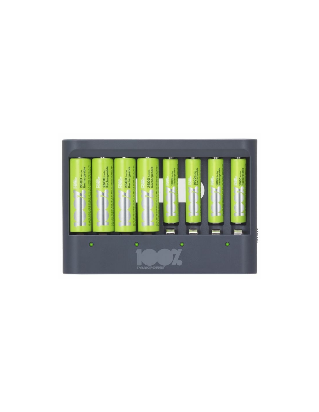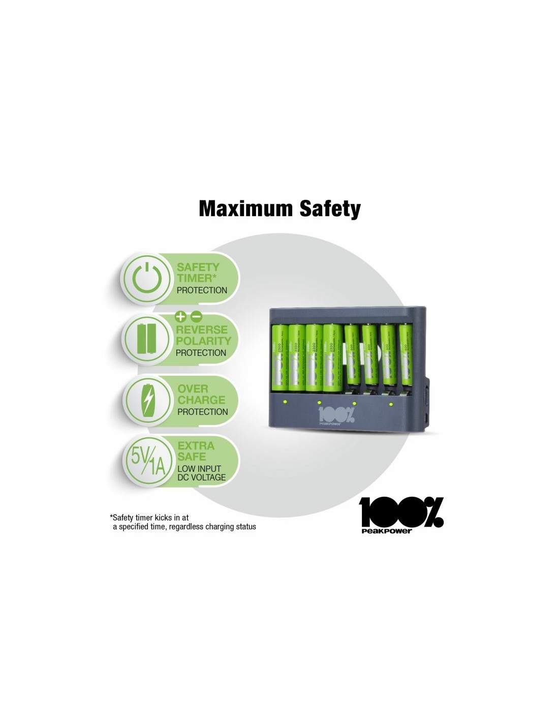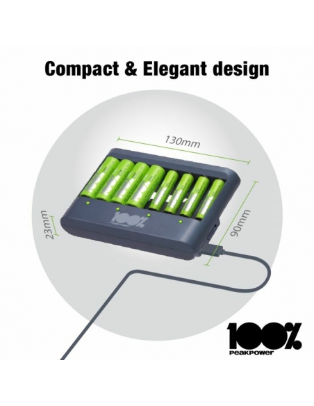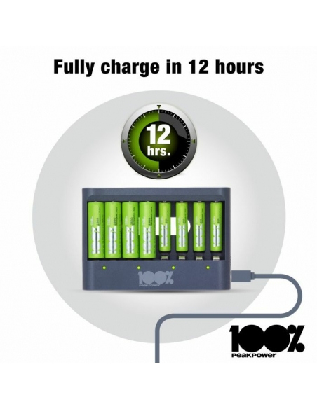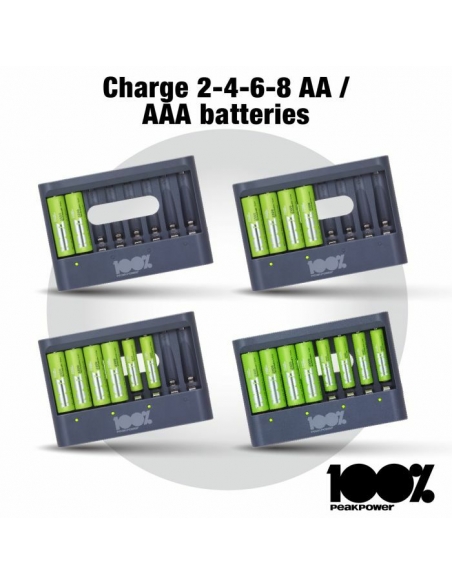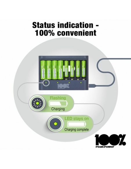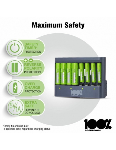 Che sia la tua torcia, controller di gioco o sveglia che necessita di nuove batterie, puoi sempre avere batterie cariche a portata di mano con il caricabatterie PPU811 da 100% PeakPower. Ha una funzione di protezione del timer di sicurezza, che impedisce il sovraccarico delle batterie. Per questo hai la certezza di batterie perfettamente cariche, sempre. I caricabatterie 100% PeakPower sono super leggeri e facili da portare con te ovunque. 100%PeakPower si impegna a mantenere le batterie al 100% del loro livello ottimale. Vai ed esplora senza preoccuparti della potenza!