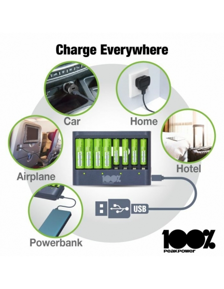 Quando usi molte batterie e hai bisogno che si carichino contemporaneamente, questo caricabatterie potrebbe essere quello che fa per te. Sei in viaggio e stai perdendo energia nelle luci da campeggio? Oppure sei in vacanza e hai bisogno di ricaricare le batterie della tua fotocamera? Con il caricabatterie PPU811 di 100% PeakPower puoi caricare le batterie in movimento con la connessione USB della piattaforma di ricarica standard mondiale.