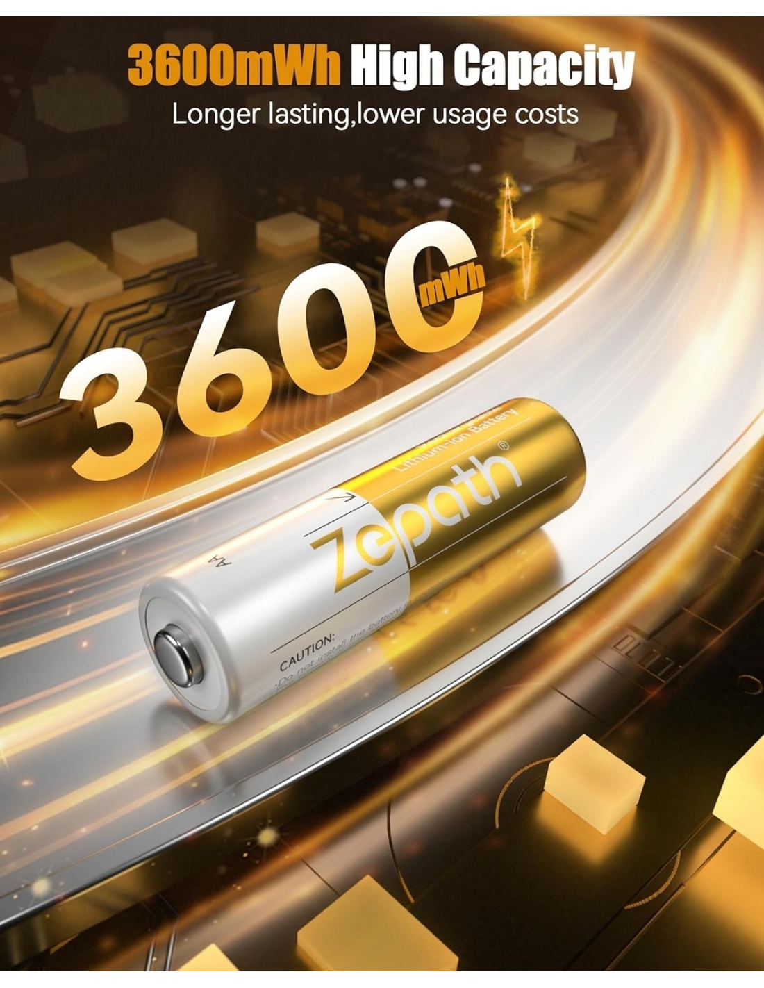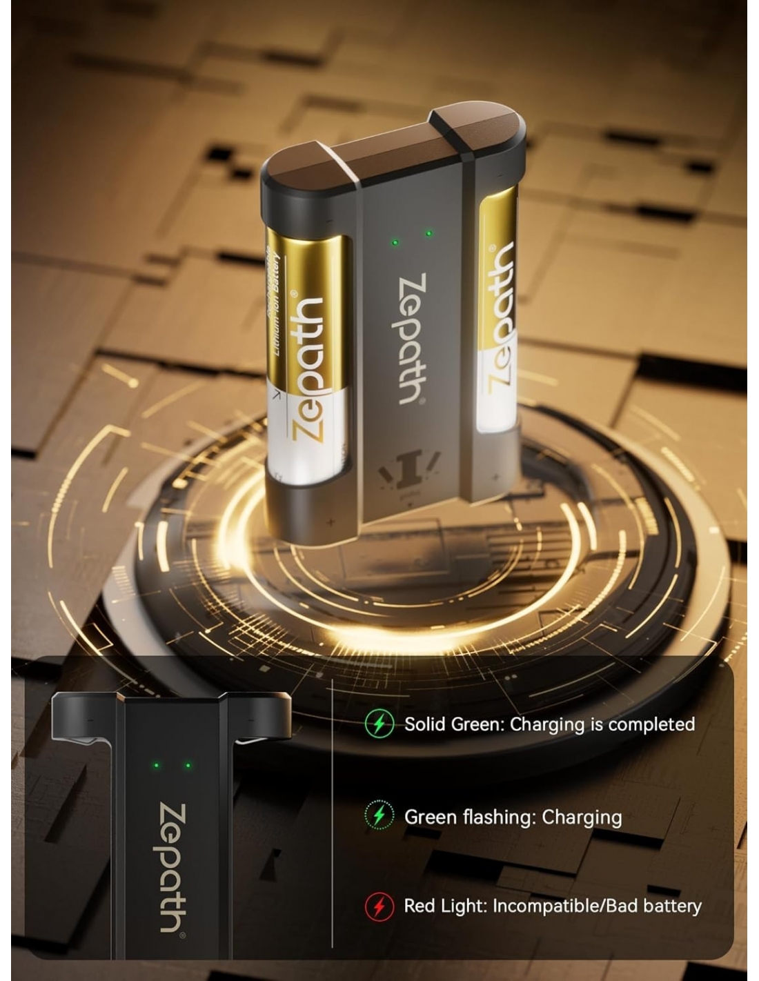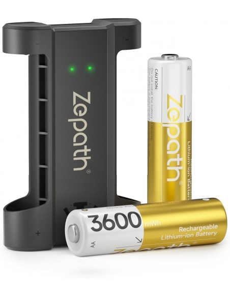 Zepath Confezione da 2 batterie AA ricaricabili al litio con caricabatterie rapido, batteria al litio AA da 1,5 V e 3600 mWh, uscita costante, doppia batteria agli ioni di litio fino a 2000+ cicli