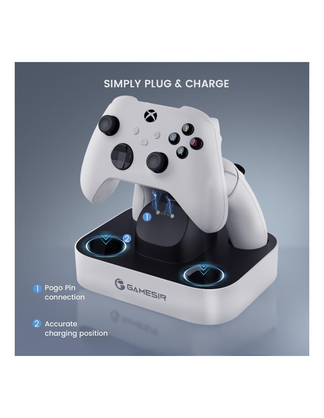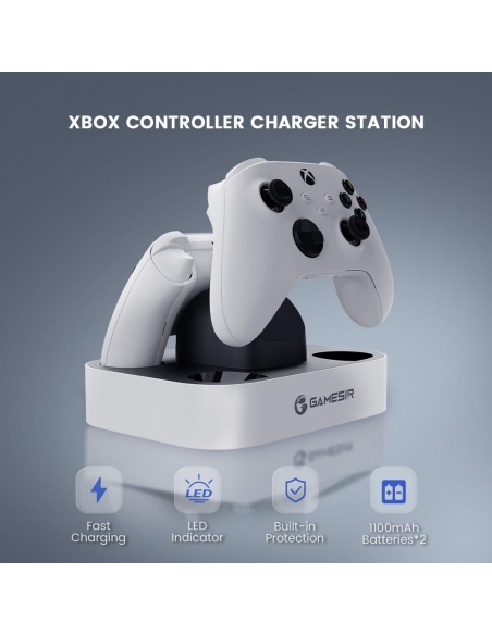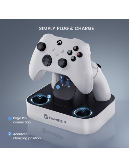 - L'indicatore luminoso della stazione di ricarica GameSir ti aiuta a controllare chiaramente il livello di potenza dei controller della serie Xbox: durante la ricarica, l'indicatore luminoso lampeggia. Quando è completamente carico/in standby, la spia è sempre accesa. GameSir è sempre pronto per il tuo gioco.
