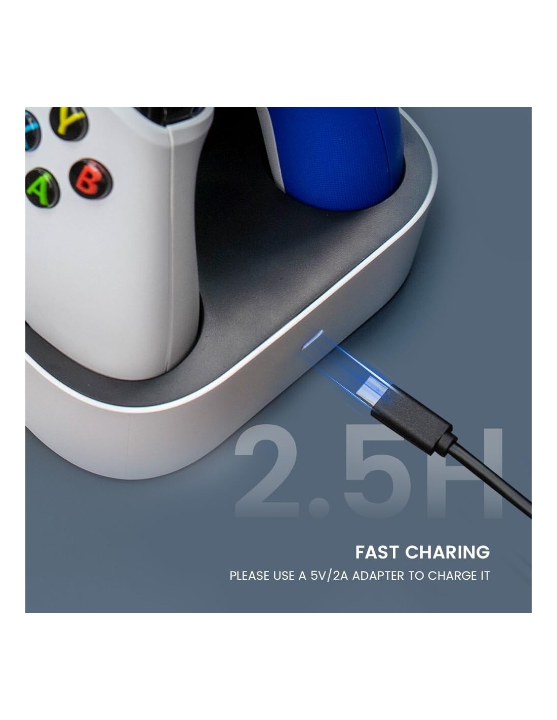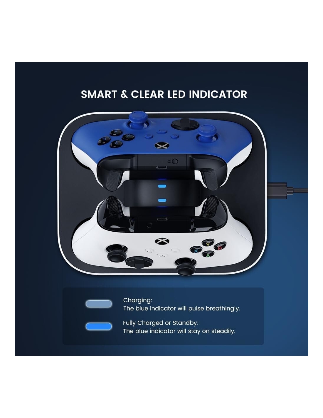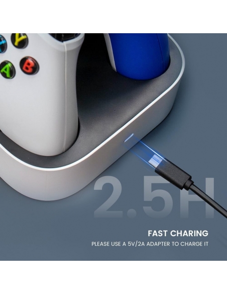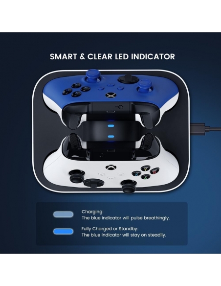 - Il caricabatterie di ciascun controller XBOX one / XBOX one X|S / XBOX serie X|S è indipendente e dispone di una funzione di protezione da sovraccarico. Quando il controller Xbox corrispondente è completamente carico, il caricabatterie interromperà la ricarica da solo senza influire su un altro controller Xbox in fase di ricarica.