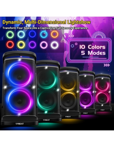 - 【Spettacolo di luce abbagliante】TPBEAT party cassa bluetooth, wireless altoparlanti bluetooth speaker supportano 10 colori chiari vibranti e 5 spettacoli di luce dinamici, creando uno spettacolo musicale colorato e brillante per la sua festa. Inoltre, 2 altoparlanti possono sincronizzare lo spettacolo di luci al neon per creare un'atmosfera abbagliante e rendere vibrante la sua festa.