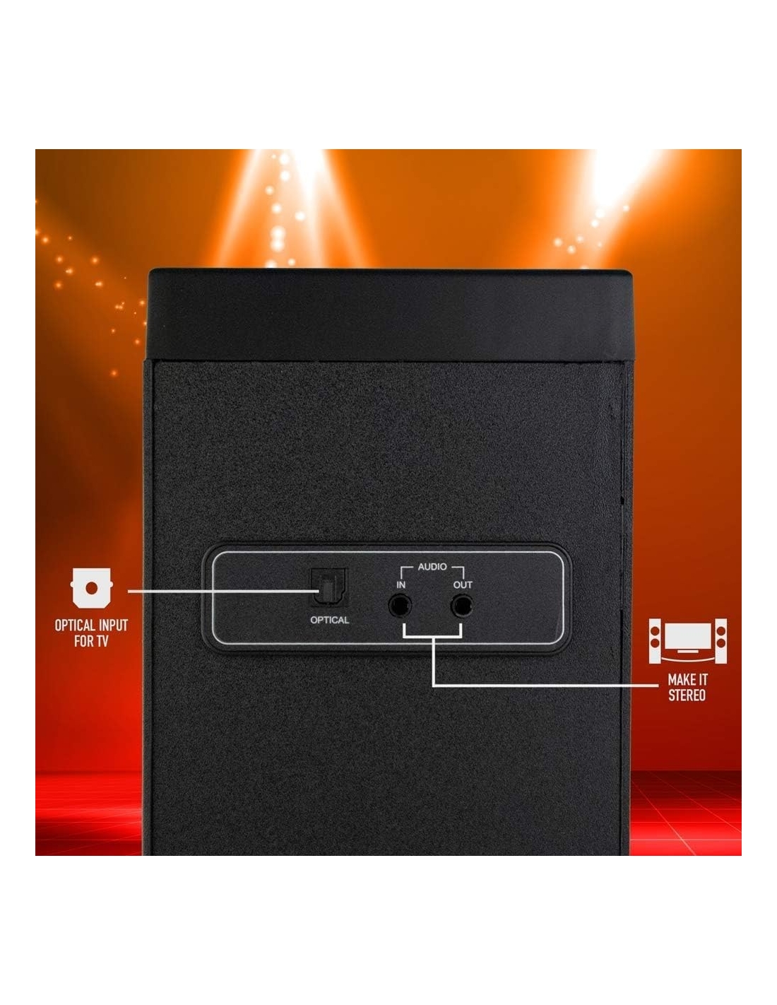 - Elegante sistema di altoparlanti a forma di torre con potenza di uscita di 50W, telecomando e con la qualità di suono grazie alla sua custodia in legno colore nero