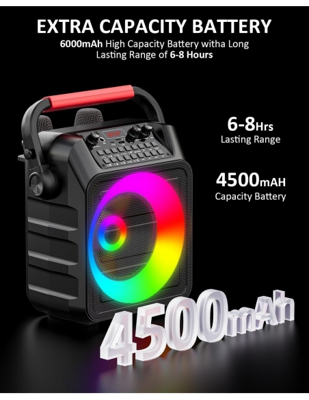 - Porta la festa karaoke ovunque:Leggera e dotata di tracolla, puoi portarla a mano o in spalla. Batteria al litio 4.500 mAh:Fino a circa 24 ore di riproduzione continua di karaoke.